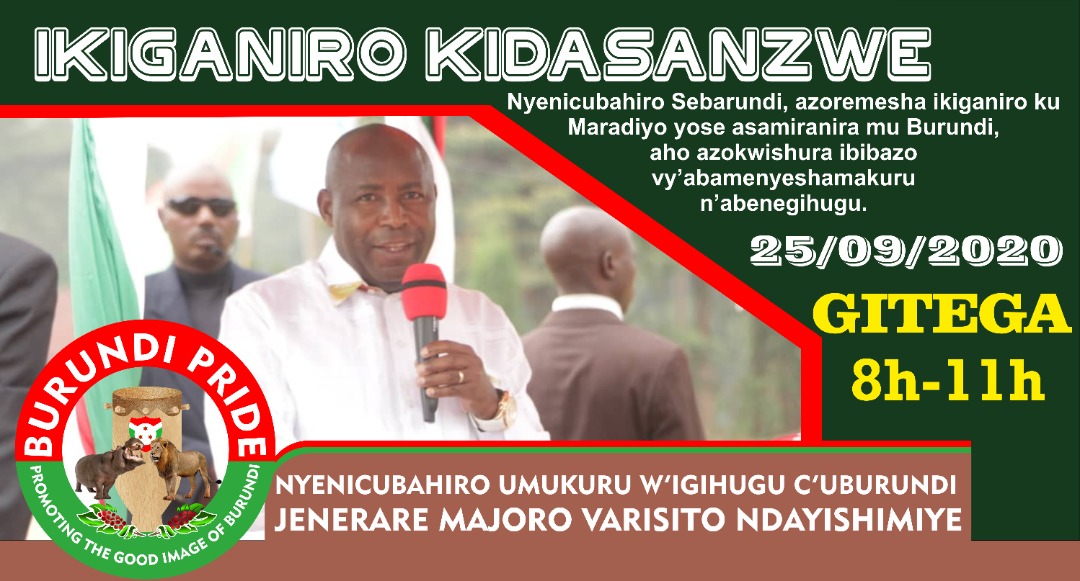 GITEGA, 25/09/2020 – S.E. NDAYISHIMIYE Evariste ( Général Major ), Président du BURUNDI, a animé une émission publique entre 8h et 11h du matin. Retransmise en direct sur la Télévision nationale, la radio, le site internet http://rtnb.bi et YOUTUBE. Destinée aux citoyens BARUNDI qui pouvaient appeler au +257 77 719 467 ou au +257 77 719 468.