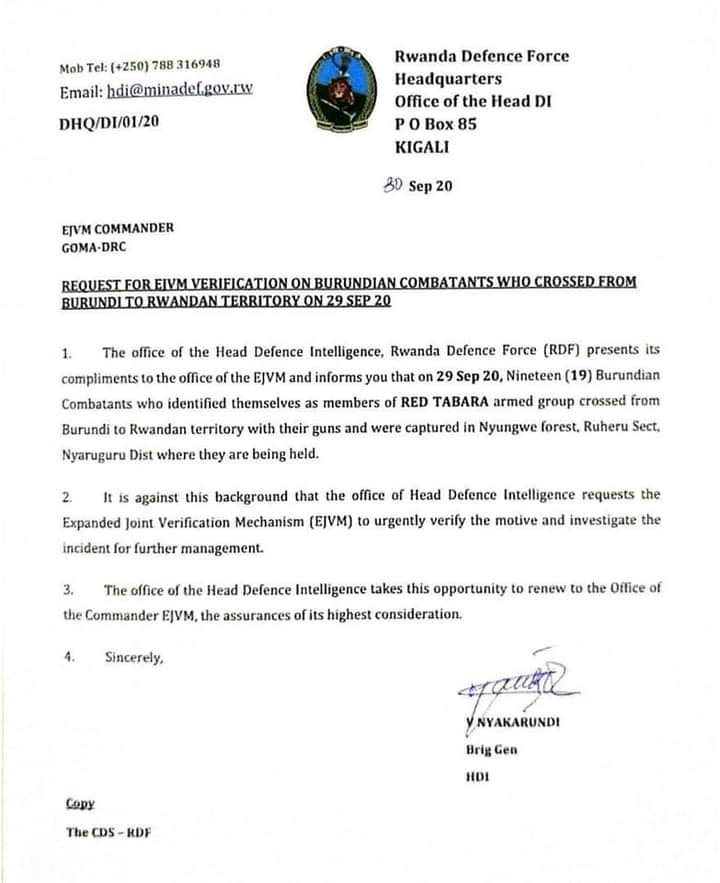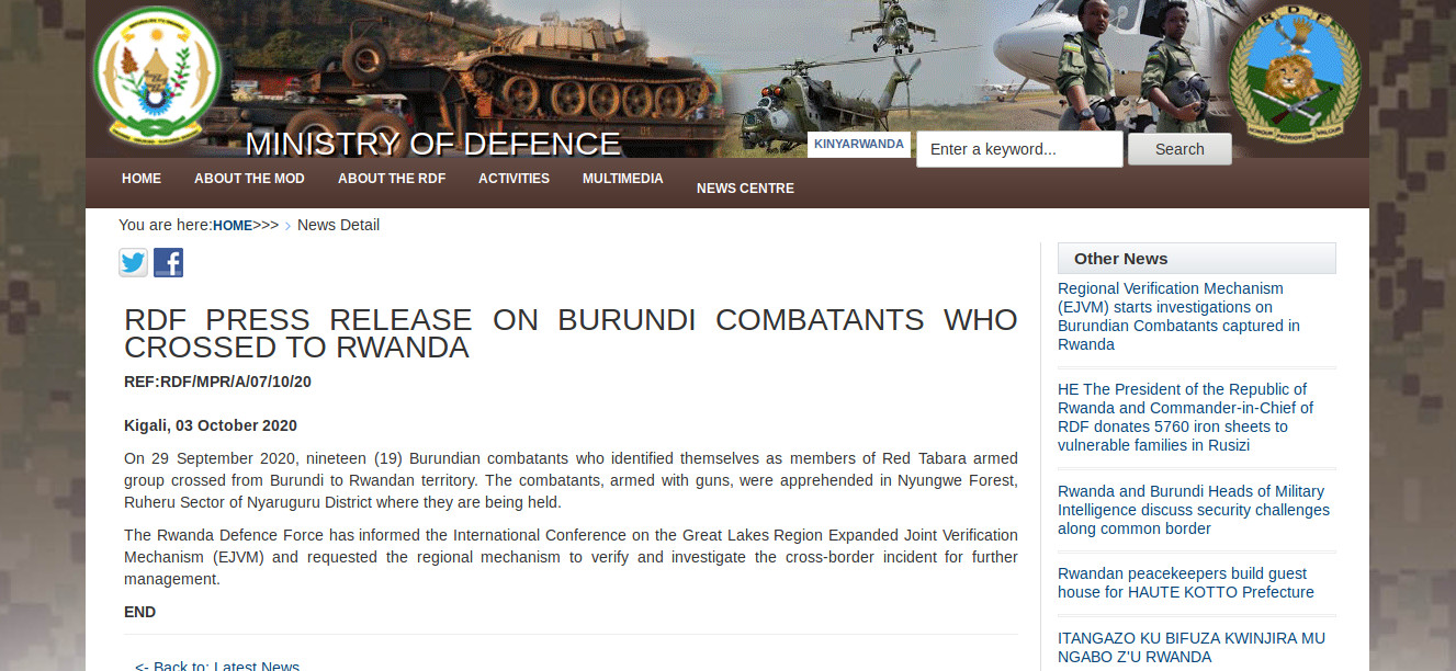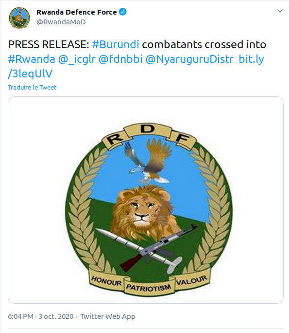 Le RWANDA a lui répondu MERCREDI 30 SEPTEMBRE 2020 , par voie officielle, par un communiqué datant de 2 jours avant celui du BURUNDI. Assurant avoir capturé 19 combattants burundais ( pas rebelles ) RED TABARA. Soulignant qu’il allait faire intervenir LE MECANISME DE VERIFICATION DE L’ INTERNATIONAL CONFERENCE ON THE GREAT LAKES REGION ( ICGLR ) afin qu’il constate.