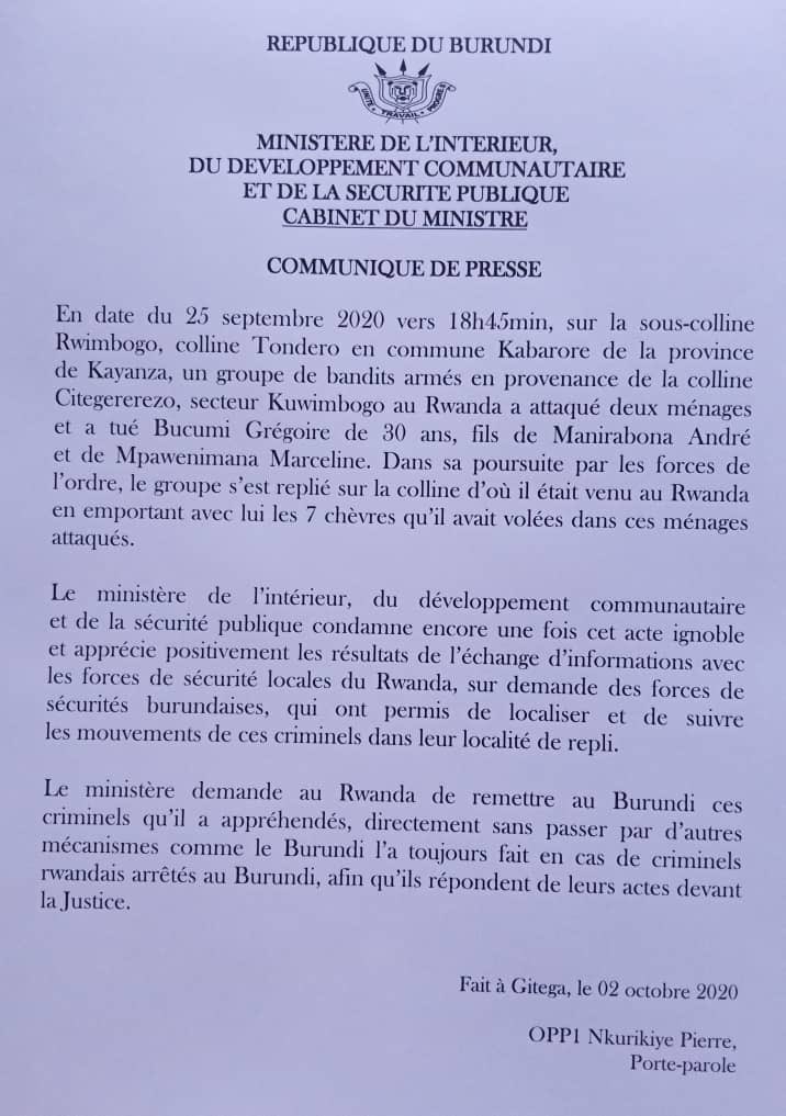 Voici le communiqué des autorités RWANDAISES datant du MERCREDI 30 SEPTEMBRE 2020, sorti le SAMEDI 3 OCTOBRE 2020 dans les média :