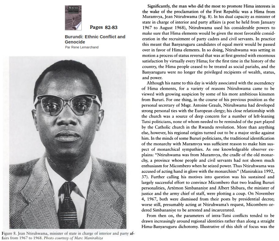 M. NTIRUHWAMA Jean ( HIMA ) [5], Ministre burundais de l’Intérieur et de l’Information, en cette période cruciale et coloniale BELGE. Directement écarta ( avec l’aval de LA BELGIQUE ) Feu MIREREKANO Paul, futur Président de l’UPRONA. A témoigné M. KIRARANGAYA Boniface, à cette époque [6].