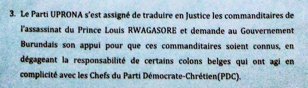 N’accusant pas ouvertement LA BELGIQUE ( « certains Colons Belges » ). Pointant un doigt accusateur sur la Famille de Feu BARANYANKA Petero ( les chefs du Parti Démocrate Chrétien – PDC ). Faussement accusée dans cette AFFAIRE de l’assassinat de Feu MUGANWA RWAGASORE Louis [2].