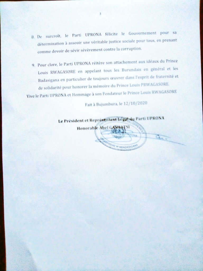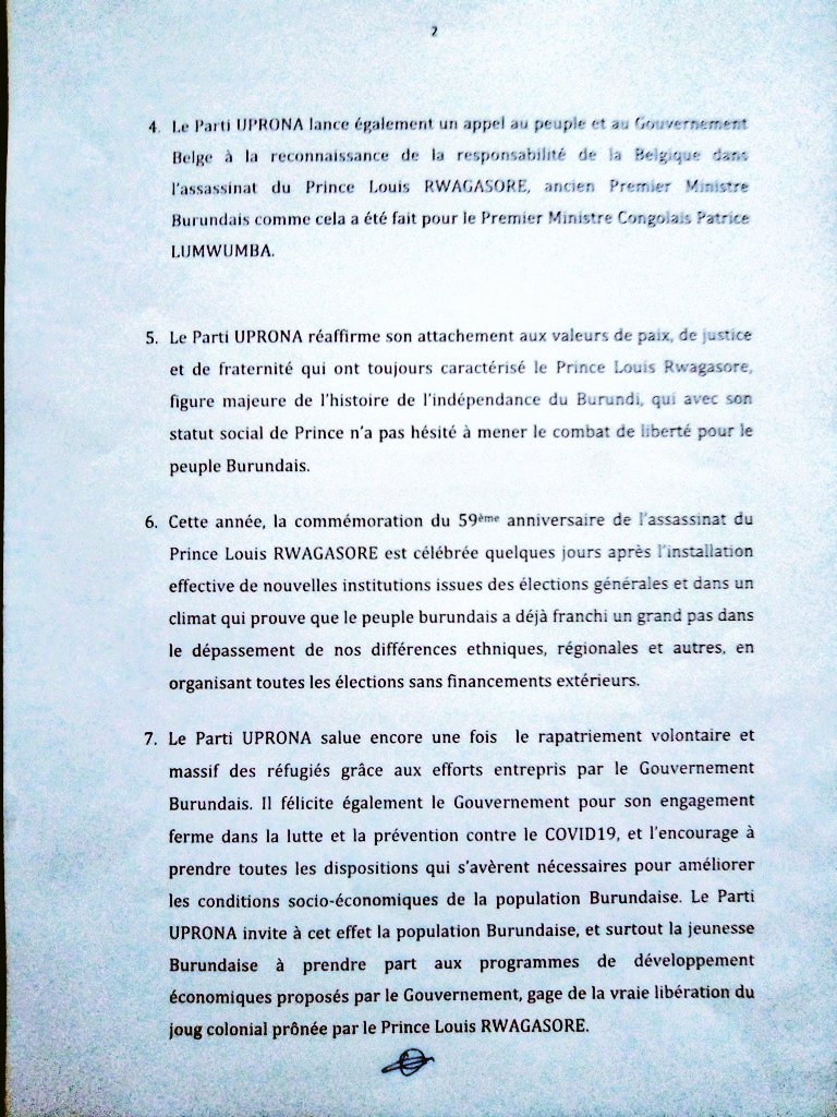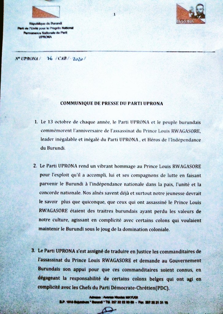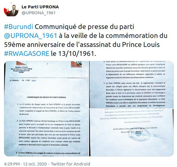 [1] Communiqué de presse du parti UPRONA à la veille de la commémoration du 59ème anniversaire de l’assassinat du Prince Louis RWAGASORE le 13/10/1961 , http://burundi-agnews.org/wp-content/uploads/2020/10/bdi_burundi_communique_uprona_rwagasore_12102020.pdf