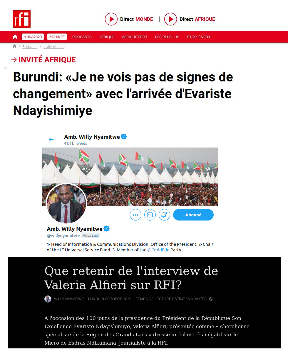 Voici la réponse de M. NYAMITWE, sur sa page FACEBOOK : https://www.facebook.com/notes/willy-nyamitwe/que-retenir-de-linterview-de-valeria-alfieri-sur-rfi/1057500911353686/