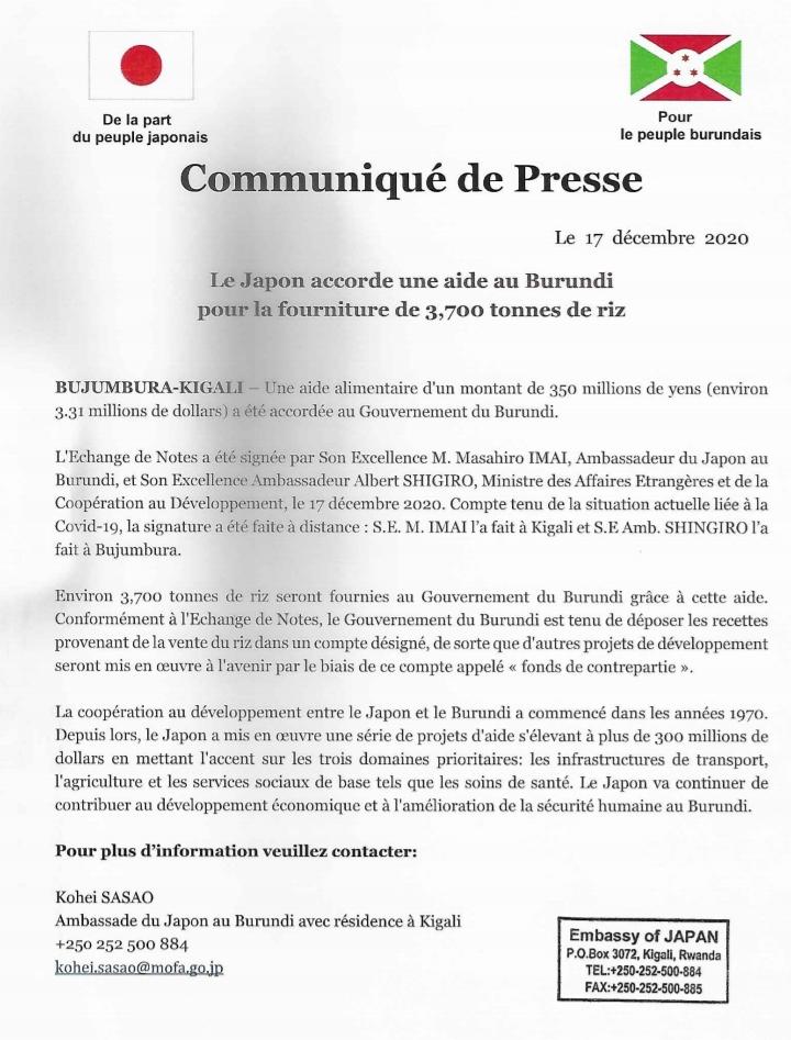 Ce don sera alimentaire dans le cadre de la Coopération bilatérale NIPPONNE – BURUNDAISE.