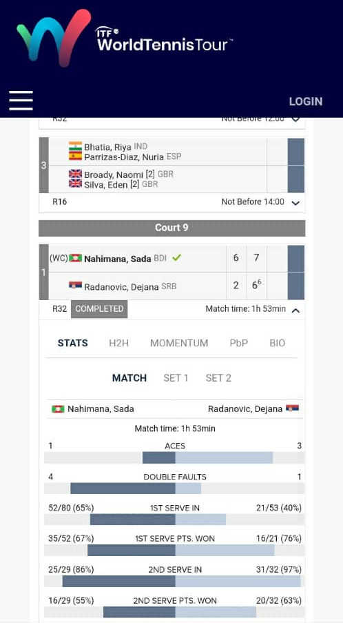 POTCHEFSTROOM, 9/02/ 2021 – Sur le score de 6/2 et 7/6 en 1h53′, la joueuse de tennis Burundaise NAHIMANA Sada (484 ème rang WTA) a battu la joueuse Serbe Dejana RADANOVIC (274 ème rang WTA) en 8 èmes de finale du tournoi de POTCHEFSTROOM en AFRIQUE DU SUD.
