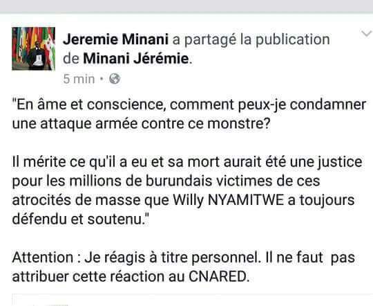 Commentaire ignominieux sur Facebook de Jérémie MINANI
