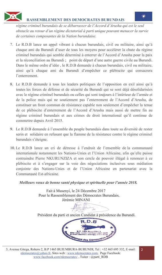 Jérémie MINANI tenterait-il de justifier les financements belgo-américano-canadiens reçus en 2014. Le communiqué de ce 11 décembre 2017 sorti par le comité exécutif de son fictif parti « Rassemblement des Démocrates Burundais » RDB non reconnu ou non connu sur le territoire burundais et des burundais mais certainement opérant sur internet comme toute autre organisation radicale utilisant parfois des sites ou media de propagande comme Boko Haram ou Al Shebab appelant au soulèvement populaire telles les publicités fleuves sur internet de Jérémie MINANI le montre , ce dernier aurait reçu une somme colossale de la part « des sénateurs démocrates américains pour financer[ les soulèvements populaires en 2015 en vue du changement du régime burundais qui restait inflexiblement intransigeant face aux demandes de signature de contrats miniers avec les Multinationales occidentales] ». Tout en passant, on peut alors comprendre l’intérêt que certains démocrates américains comme Samanta Power et autres avaient au Burundi en 2015 et avant. Le même communiqué précise que « Jérémie MINANI a reçu un financement de 240.000 USD » soit approximativement 600.000.000 FBU . Vous comprendrez que même les autres organisateurs des événements de 2015 pour destituer le Président Pierre NKURUNZIZA avaient aussi reçu des financements colossaux pour cette fin. Nul n’ignore par exemple que le trio Margarite BARANKINTSE, Pacifique NININAHAZWE et MBONIMPA percevaient des fonds y relatifs et que MBONIMPA devrait en assurer la coordination. C’est dans cette logique que cette somme allouée à Jérémie MINANI devrait servir à nourrir et encadrer les jeunes manifestants, payer les mutins des forces de l’ordre et les coordonateurs du mouvement « Halte au troisième mandat, soigner les blessés et enterrer les morts , tel un arsenal logistique capable de déposer un Etat faible », a précisé ma source.