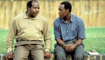 [Photo : Paul Rusesabagina (à gauche), ici lors du tournage du film « Hôtel Rwanda » au côté de Don Cheadle (à droite).]