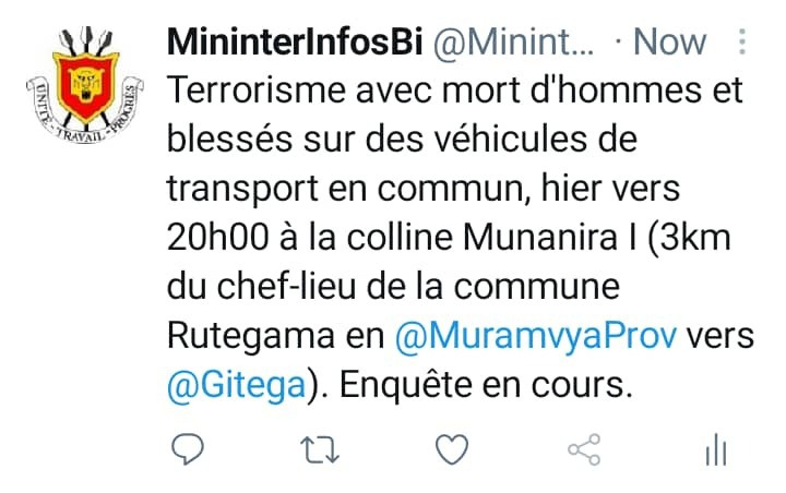 MURAMVYA ( Commune RUTEGAMA ), 26/06/2021 – La POLICE NATIONALE DU BURUNDI (PNB) a informé qu’ un groupe terroriste a organisé une embuscade sur des bus de transport en commun à MURAMVYA, vers 20h00, en colline MUNANIRA I. MURAMVYA est une province frontalière de GITEGA, capitale du BURUNDI.