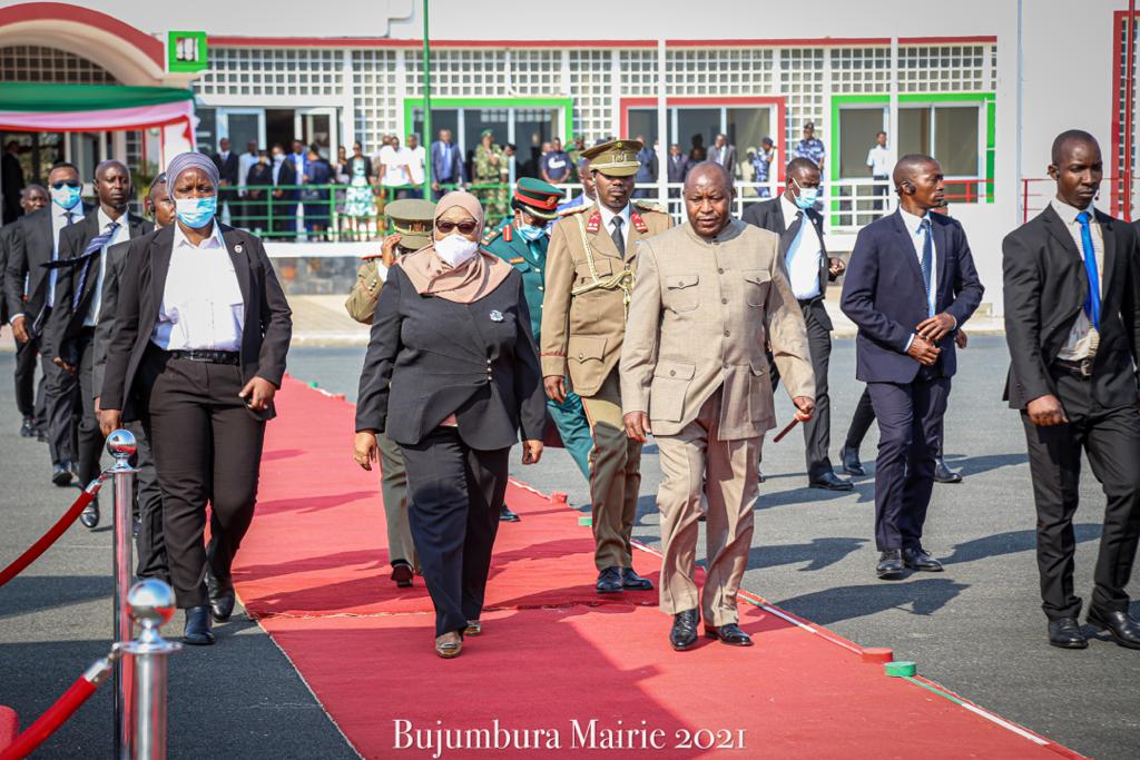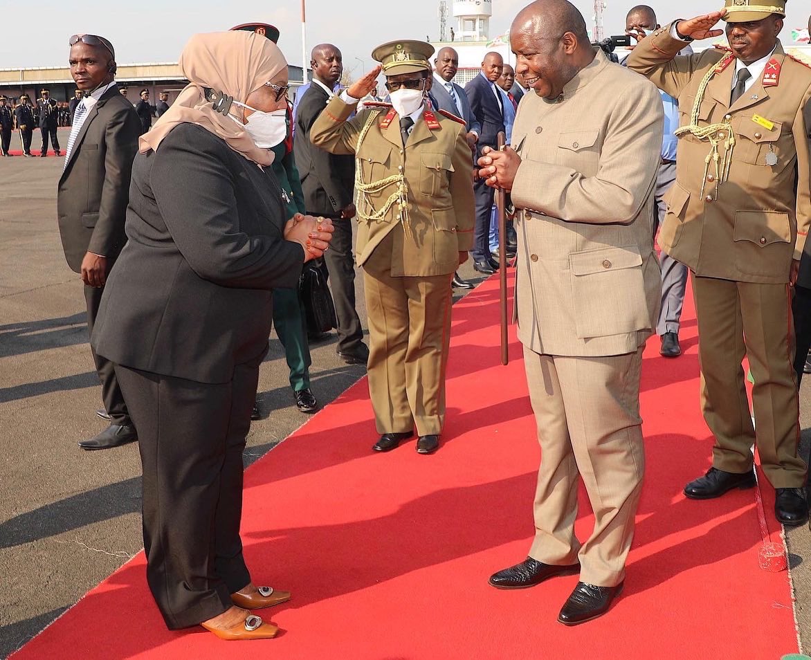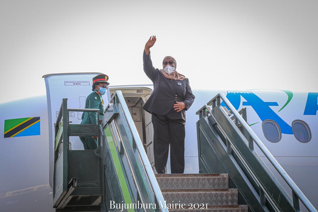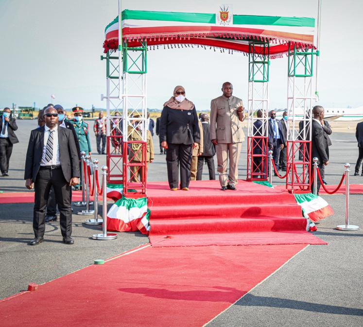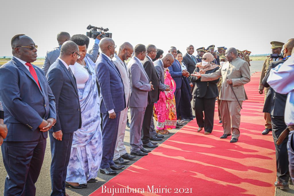 BUJUMBURA ( Aéroport NDADAYE MELCHIOR ), 17/07/2021 – Accompagnée par S.E. NDAYISHIMIYE Evariste ( Général Major ), Président du BURUNDI. S.E. SULUHU Samia Hassan, Présidente de LA TANZANIE, a clôturé sa visite d’État au BURUNDI. Saluant un bon nombre de personnalités BARUNDI alignées en file et présentées par le chef d’état DES BARUNDI.