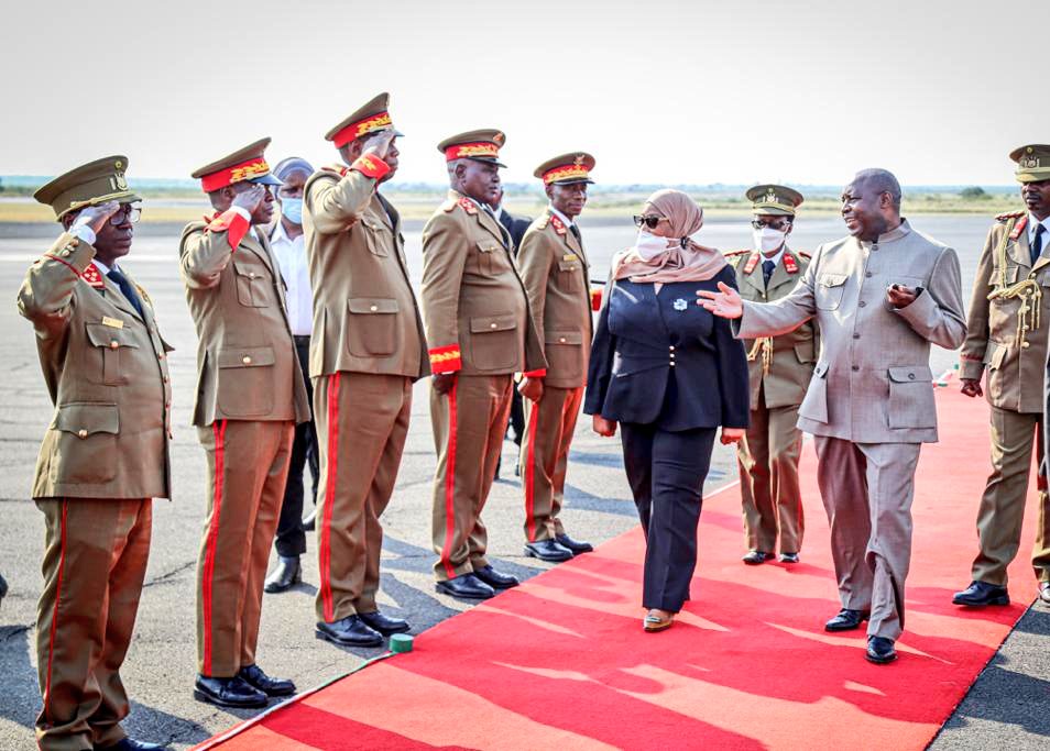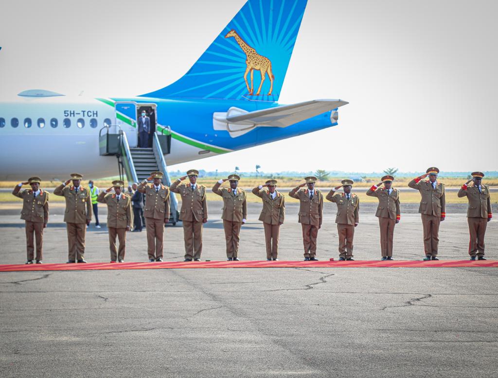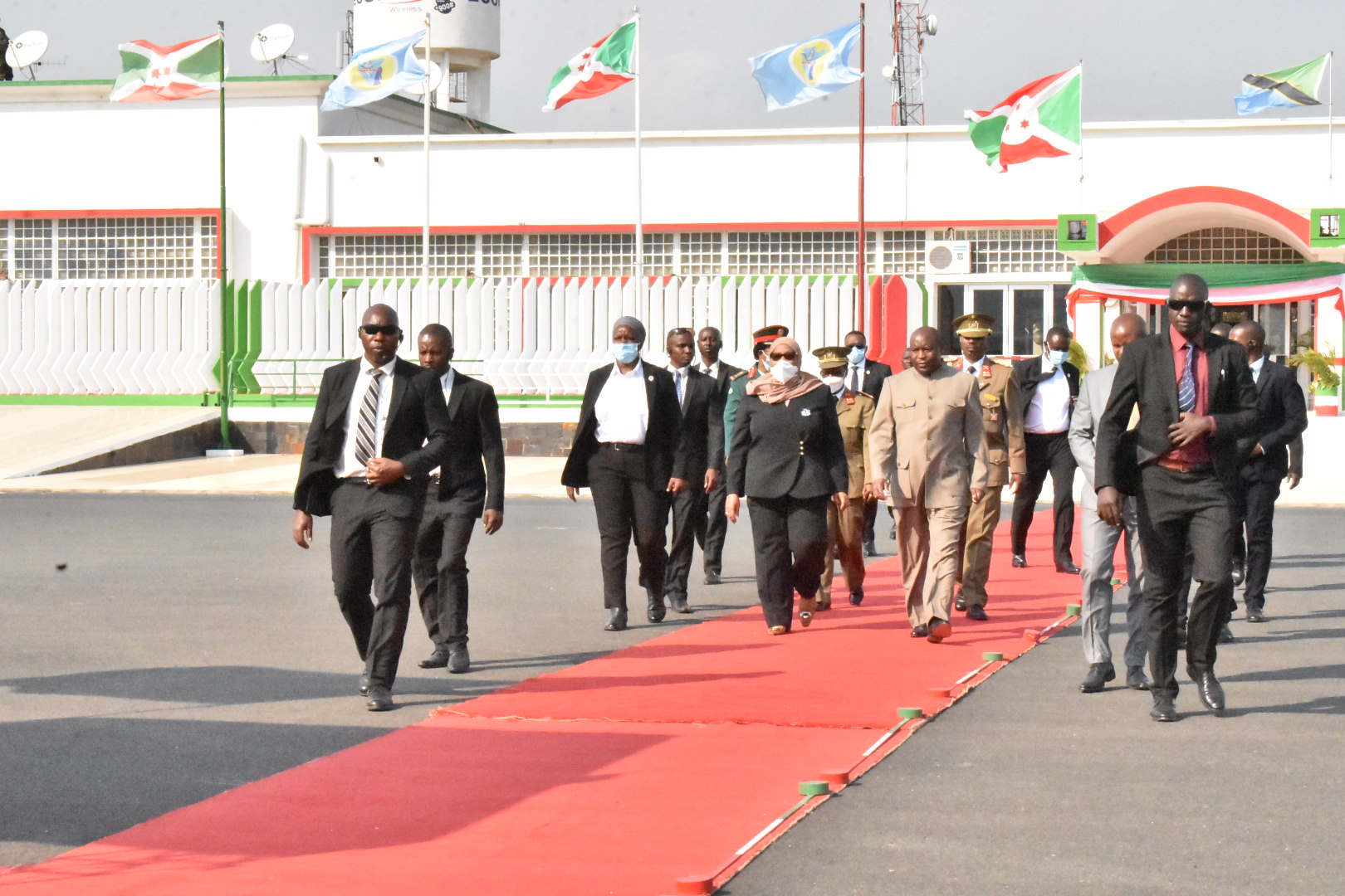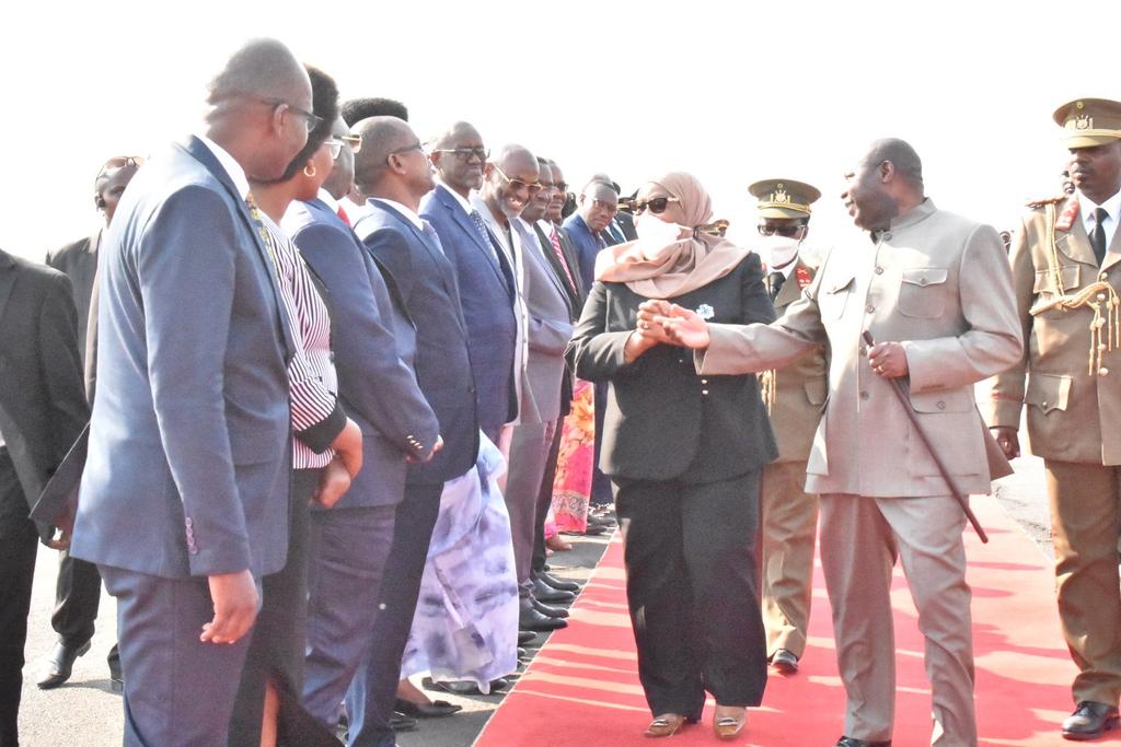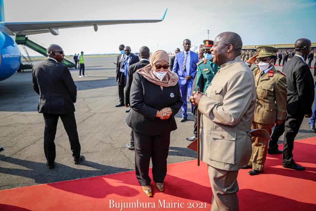 BUJUMBURA ( Aéroport NDADAYE MELCHIOR ), 17/07/2021 – Accompagnée par S.E. NDAYISHIMIYE Evariste ( Général Major ), Président du BURUNDI. S.E. SULUHU Samia Hassan, Présidente de LA TANZANIE, a clôturé sa visite d’État au BURUNDI. Saluant un bon nombre de personnalités BARUNDI alignées en file et présentées par le chef d’état DES BARUNDI.