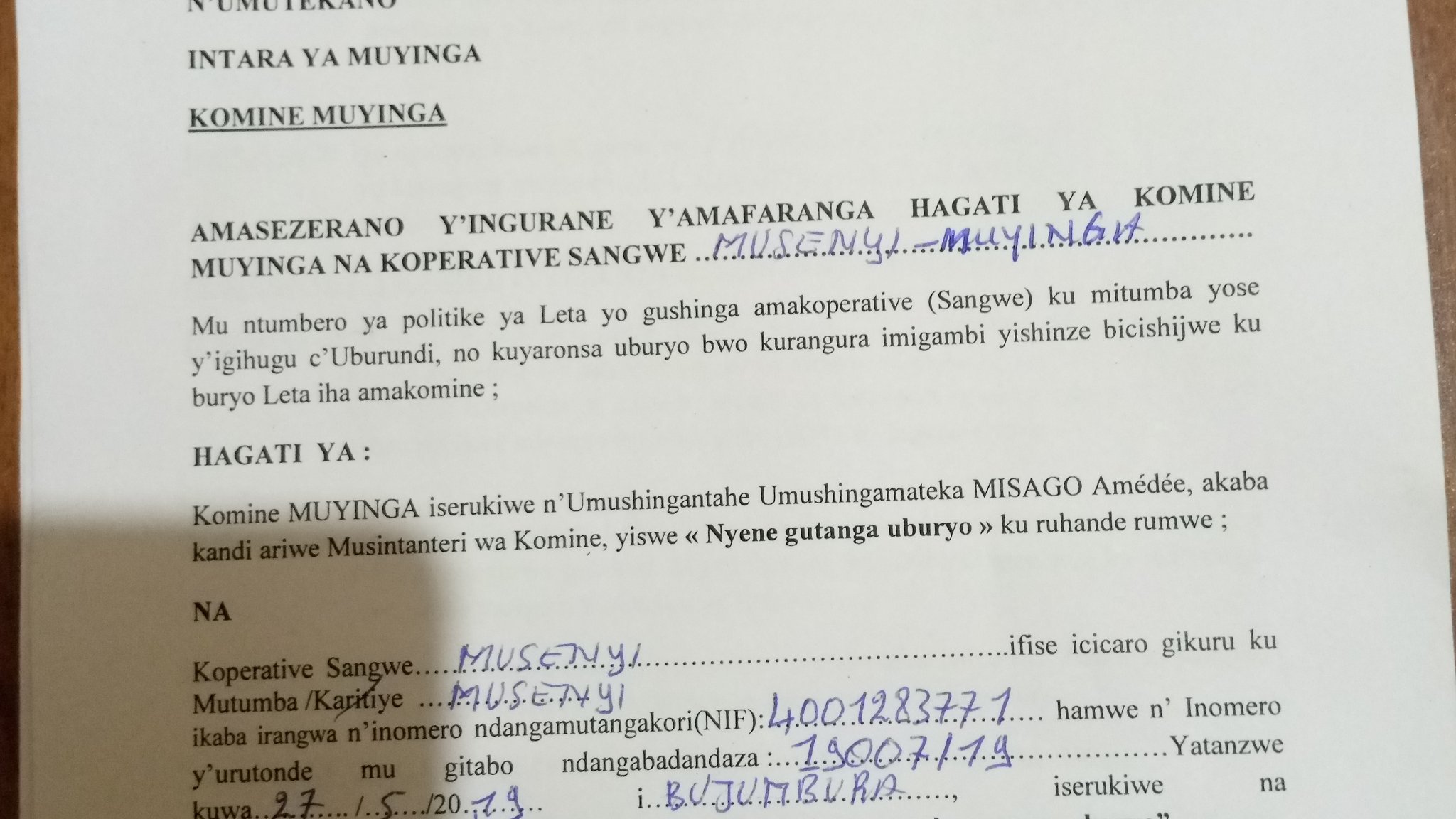 MUYINGA ( Commune MUYINGA ), 17/09/2021 – M. MISAGO Amédée, Administrateur communal de MUYINGA, organisait une réunion de signatures de conventions d’emprunt. Destinée aux responsables des coopératives collinaires SANGWE de la commune MUYINGA. Octroyant 10 Millions BIF (5.000 USD) à chaque coopérative.