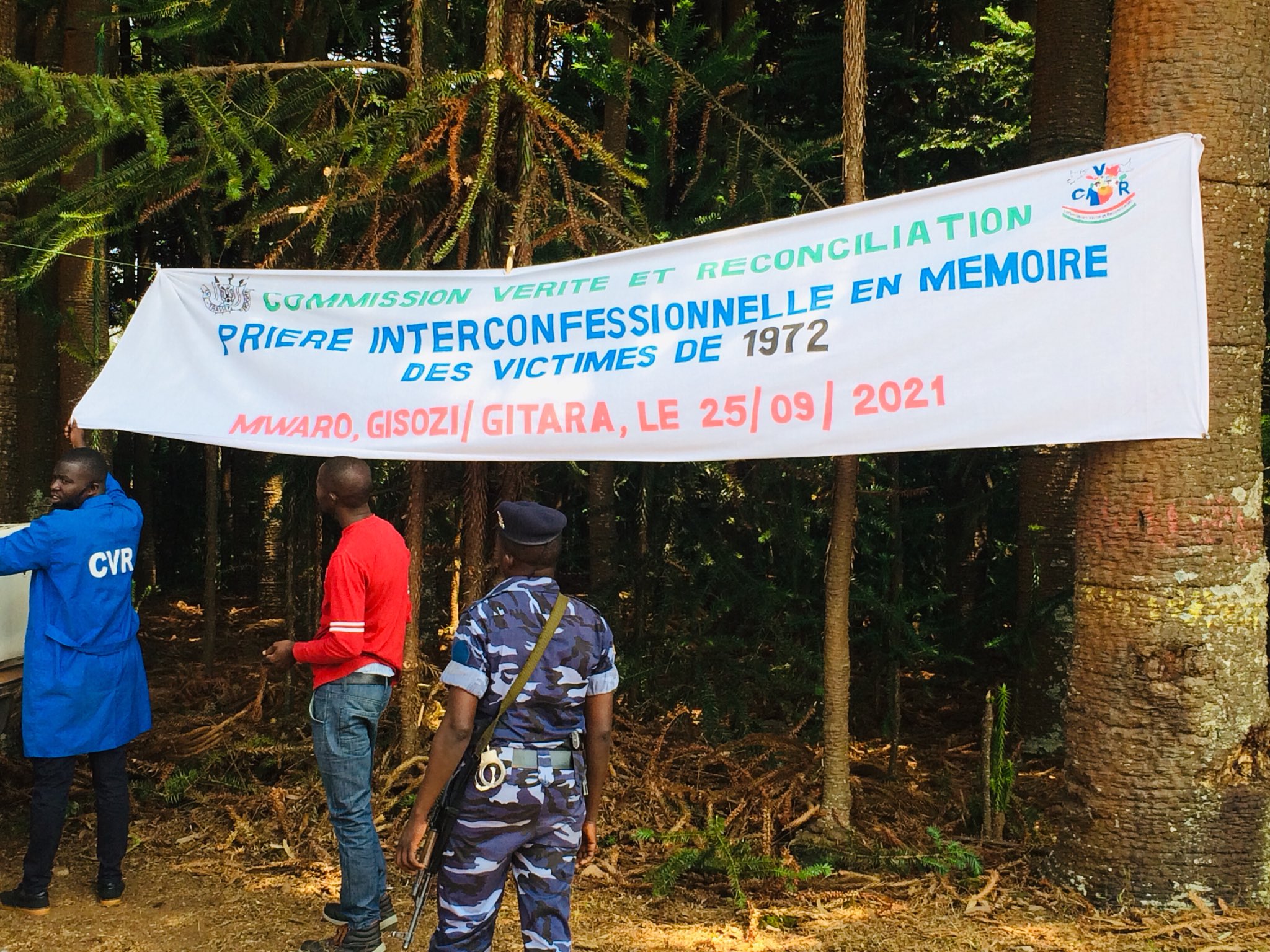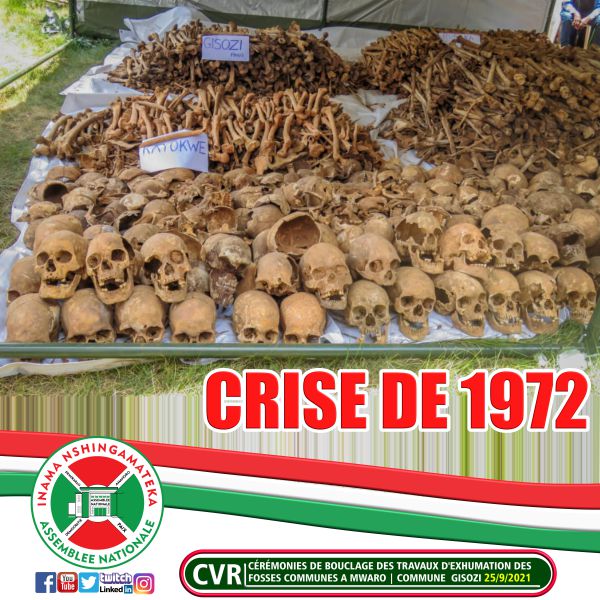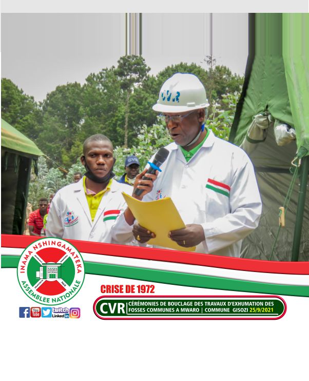 MWARO ( Commune GISOZI ), 25/09/2021 – Reçue par M. GASANZWE Gaspard ( Colonel ), Gouverneur de MWARO. En présence de hautes personnalités tel l’Hon. NDADAYE Denise, Vice Président du SENAT DU BURUNDI ( sœur du héros national Feu NDADAYE Melchior ), l’Hon GASHATSI Abel, Vice Président de L’ASSEMBLÉE DU BURUNDI, etc. A GITARA, le très respectable M. NDAYICARIYE Pierre Claver, Président de la Commission Vérité Réconciliation ( CVR ) du BURUNDI, présentait, en zone GISOZI, colline NYAMIYAGA, sous colline BANDA, un bilan provisoire de ses recherches . Relatant les travaux d’exhumation des restes humains en province de MWARO. Réalisés pendant 3 semaines. Cadrant avec LE GENOCIDE CONTRE LES BAHUTU DU BURUNDI DE 1972 [1]. Parlant de 1.098 corps exhumés de 17 fosses communes. Précisément : – 756 corps exhumés dans 9 fosses communes de GISOZI ; – 322 corps exhumés dans 7 fosses communes de RUSAKA ; – et 20 corps exhumés dans 1 fosse commune de KAYOKWE .