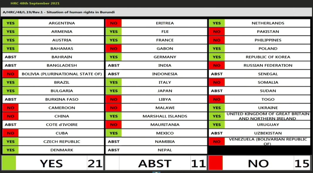 Lors du vote au CONSEIL DES DROITS DE L’HOMME DE L’ONU, la tension était palpable entre les pays AFRICAINS et EUROPEENS. Après avoir décidé de stopper LA COMMISSION DOUDOU DIENE, la défaite de ces FAMILLES D’EX-COLONS ET ESCLAVAGISTES étant à son comble. Ces derniers ont poussé une dernière résolution au CONSEIL DES DROITS DE L’HOMME DE L’ONU. Ressemblant plus à un bras d’honneur. Demandant la nomination d’un rapporteur spécial ONU chargé de surveiller la situation des droits de l’homme au Burundi. Poursuivant ainsi leur acharnement et leur GUERRE HUMANITAIRE CONTRE LE BURUNDI.