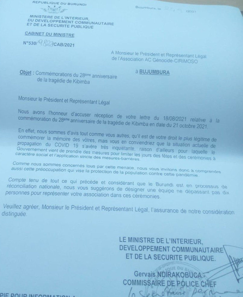 BUJUMBURA, 19/10/2021 – Le Ministère burundais de l’Intérieur, en signe de pluralisme d’opinion, a donné la permission à AC GENOCIDE CIRIMOSO, organisation d’ Extrême Droite HIMA burundaise [1], de pouvoir commémorer L’EVENEMENT DE KIBIMBA du jeudi 21 octobre 1993 [2]. Faisant suite à L’ASSASSINAT DE FEU NDADAYE Melchior, Président du BURUNDI, Héros national des baRUNDI.