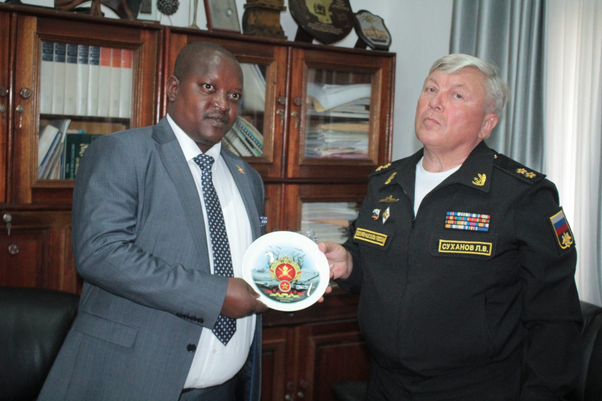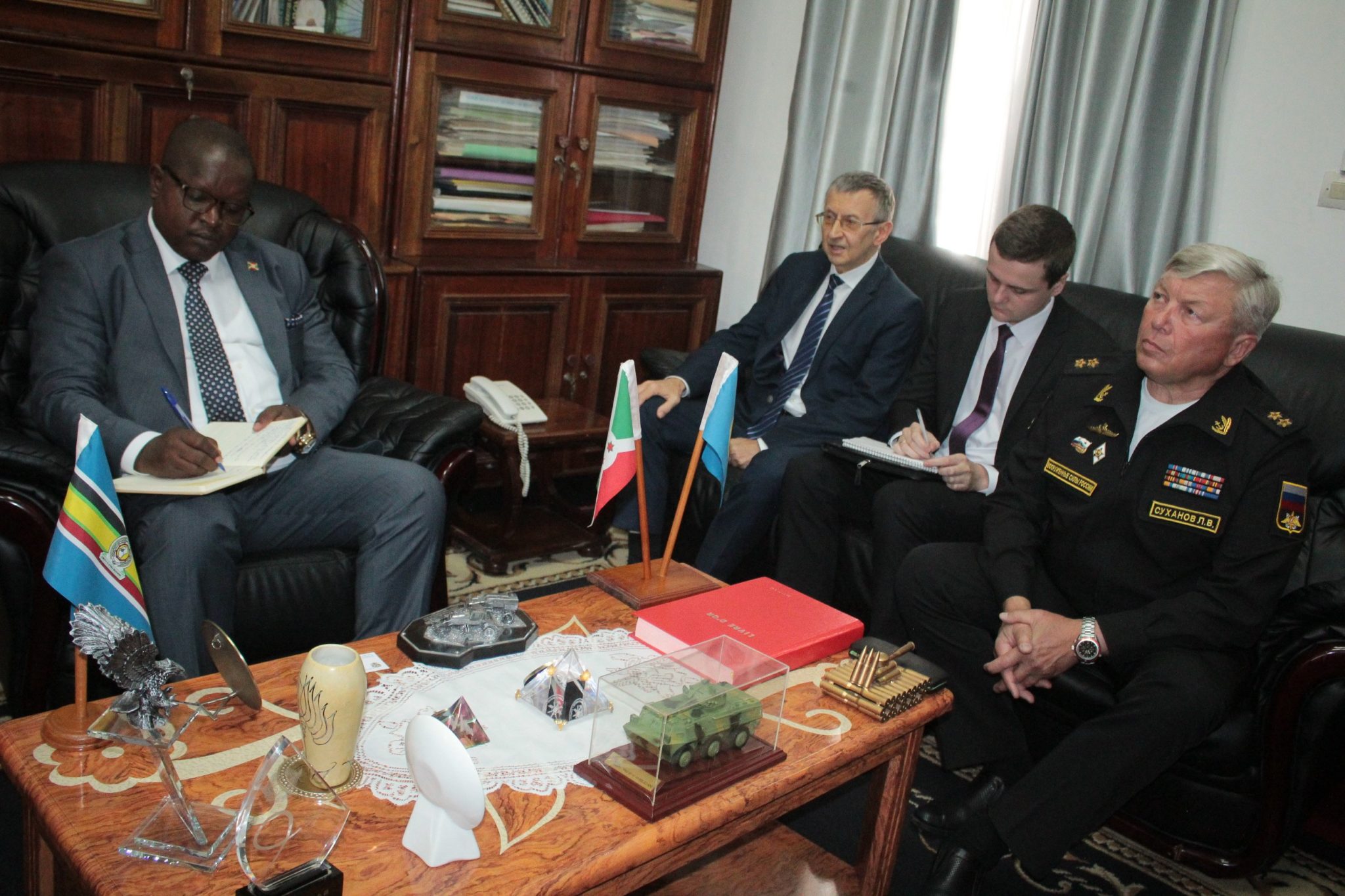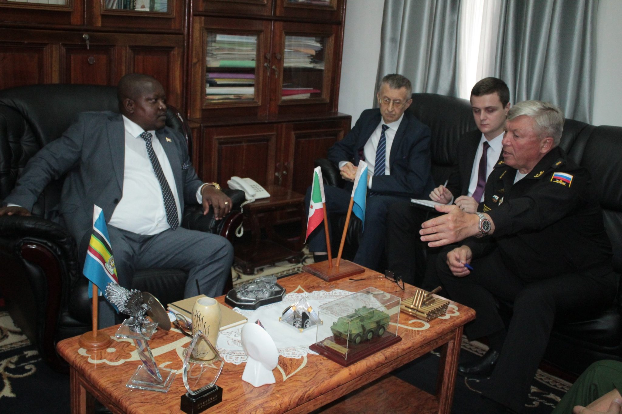 BUJUMBURA, 25/11/2021 – M. MUTABAZI Alain Tribert, Ministre burundais de la défense et des anciens combattants, recevait le Vice-Amiral Russe, L. SUKHANOV, chargé de la coopération militaire RUSSE en AFRIQUE DE L’EST. Accompagné de S.E. Valery A. MIKHAYLOV, Ambassadeur de RUSSIE au BURUNDI. Échangeant sur un renforcement de la coopération militaire entre LE BURUNDI et LA RUSSIE, pays amis.