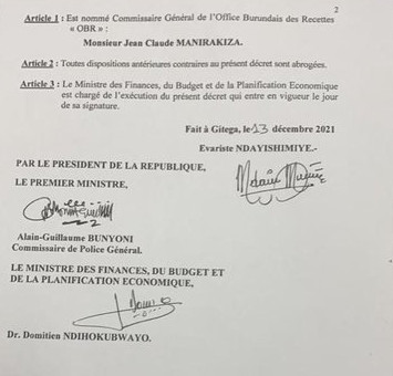 GITEGA, 13/12/2021 – M. MANIRAKIZA Jean Claude, Directeur Commercial à LA BANQUE COMMERCIAL DU BURUNDI, devient le nouveau patron de L’OFFICE BURUNDAISE DES RECETTES (OBR). Remplaçant M. MUNYESHONGORE Pacifique, actuel Commissaire Général de L’OBR. Faisant suite à un décret présidentiel.