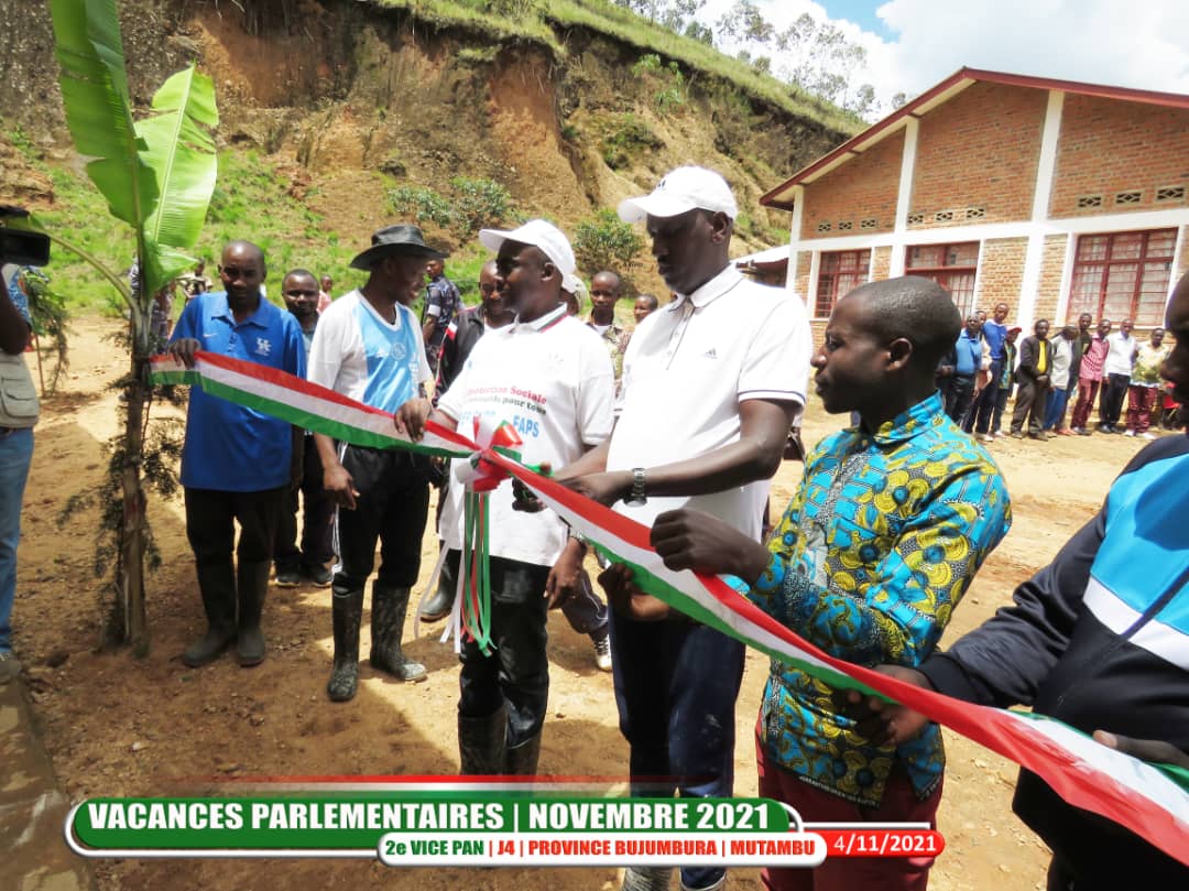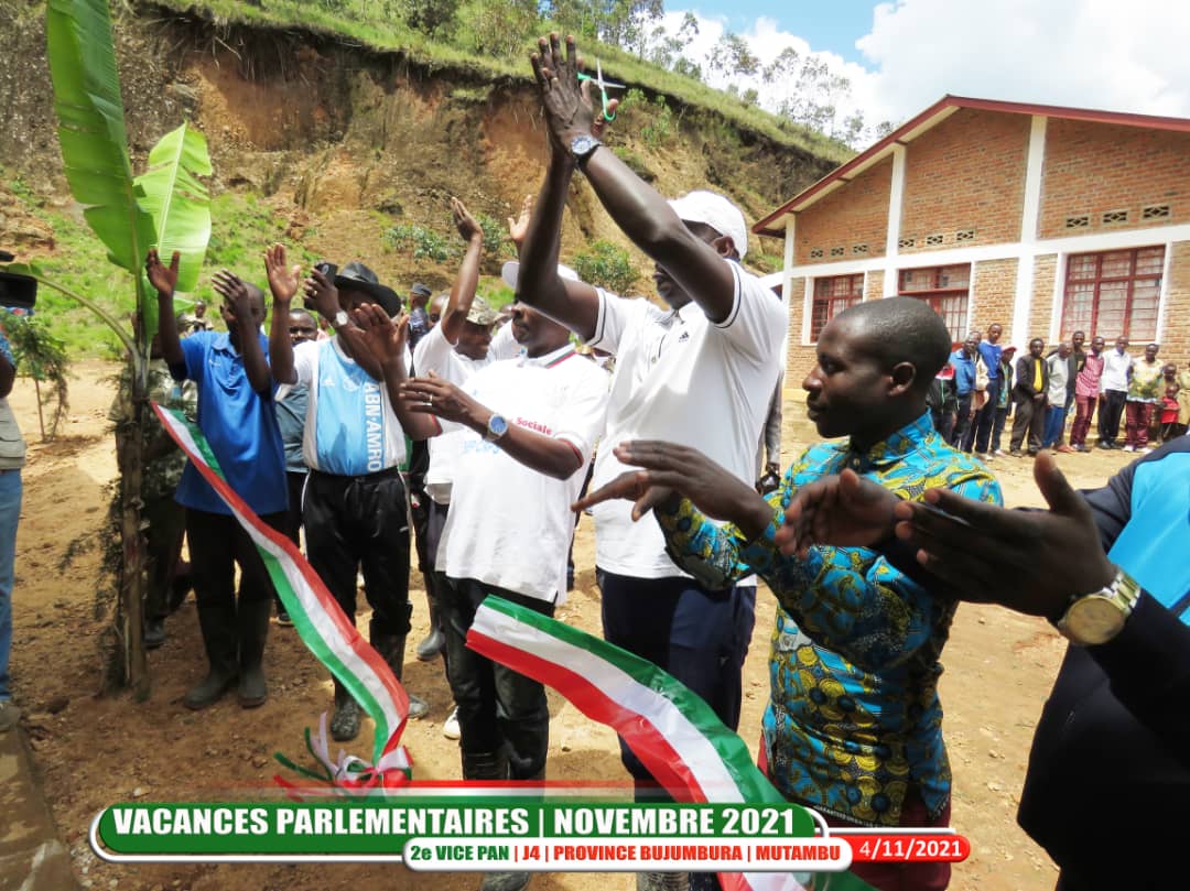 BUJUMBURA ( Commune MUTAMBU ), 5/11/2021 – Reçu par M. NIYONGABO Jean Pierre, Administrateur Communal de MUTAMBU. Accompagné par M. NDARUYUKANYE Zénon ( CNDD-FDD ). L’Hon. GASHATSI Abel ( UPRONA ), Vice Président de l’Assemblée Nationale du Burundi, a inauguré le bâtiment du Bureau du chef Collinaire de GOMVYI [ http://bdiagnews.com/inaugurations ]. Étant le lien administratif entre la colline et la commune. Construit par les citoyens de la localité lors des Travaux de Développement Communautaire [ TDC – http://bdiagnews.com/TDC ].