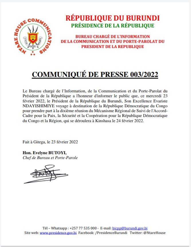 Accompagné de l’excellent Ministre burundais des Affaires Etrangères M. SHiNGiRo Albert, S.E. NDaYiSHiMiYe Evariste ( Général Major ), Président du BuRuNDi, s’est rendu à KiNSHaSa (RDC), prenant part à la 10ème réunion du Mécanisme Régional de Suivi de l’Accord-Cadre pour la Paix, la Sécurité et la Coopération pour la RDC et la Région des Grands Lacs, relatif au Conseil de Sécurité de l’ONU [2].