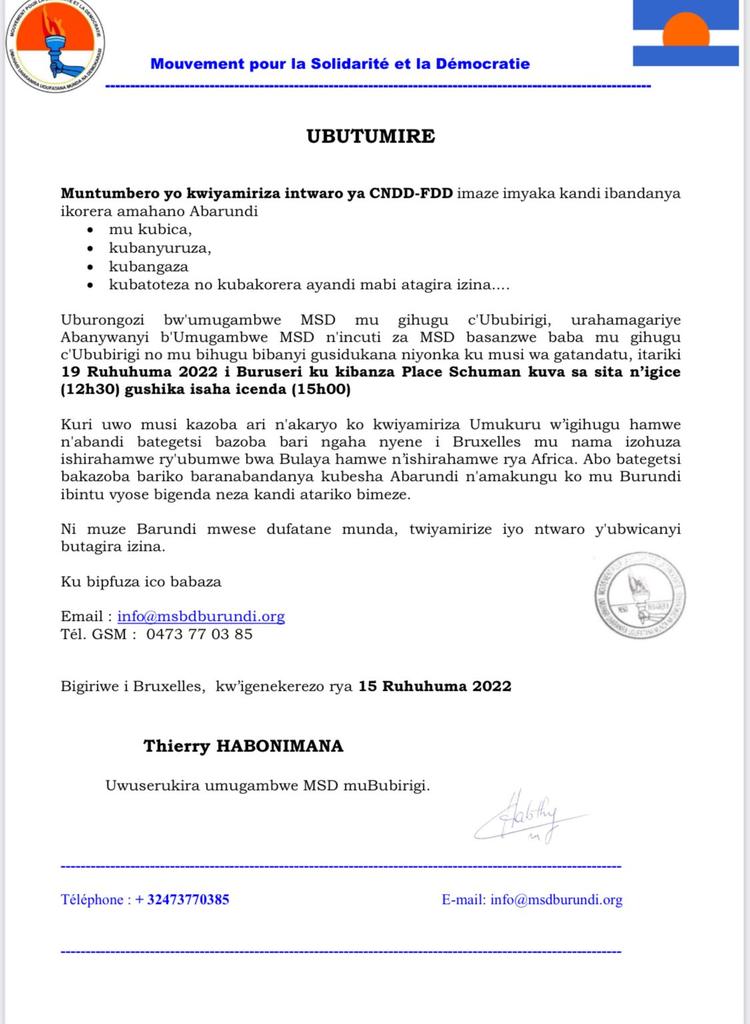 Le mardi 22 février 2022, l’Hon. RWASA Agathon, Président du CNL, a tenté de minimiser les propos et les actes de M. MaGeRa Aimé [1] , iNYaNKaMuGaYo ( nom des militants du CNL ), vivant en Belgique, siège de l’Union Européenne et de l’OTAN, se présentant comme le représentant du CNL en Europe, ayant lancé un appel à une manifestation contre la venue du Président du BuRuNDi en Belgique [2], en Front commun MSD-CNL. Ainsi, fréquentant M. SiNDuHiJE Alexis, recherché par Interpol, vivant sur ces mêmes lieux, responsables du MSD et du RED TABARA, rassemblant des civils et des militaires ayant réalisé le putsch militaire raté du mercredi 13 mai 2015 au BuRuNDi, actuellement évoluant entre le RWaNDa et la RDC Congo , en commettant des actes terroristes seulement à l’Est de la RDC et au BuRuNDi.