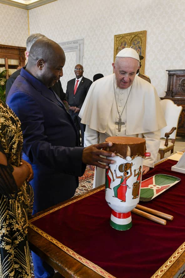 En visite d’état au Vatican, accompagné de sa délégation et de son épouse S.E NDaYuBaHa Angéline, Première Dame du BuRuNDi, S.E. NDaYiSHiMiYe Evariste ( Général Major ), Président du BuRuNDi, en costume abacost, a été reçu par S.E. le Pape François, chef spirituel de l’Eglise Catholique, destinée au peuple du Christ Jésus. Présentant au Saint Père des catholiques, les projets du BuRuNDi et la situation sociopolitique du pays. Après un échange amical, s’entretenant avec le cardinal Pietro Parolin, secrétaire d’État, ainsi que Monseigneur Paul Richard Gallagher, secrétaire pour les relations avec les États. Exprimant sa gratitude au Vatican engagé, à travers sa coopération bilatérale, à l’appui de la politique socio-économique du BuRuNDi.