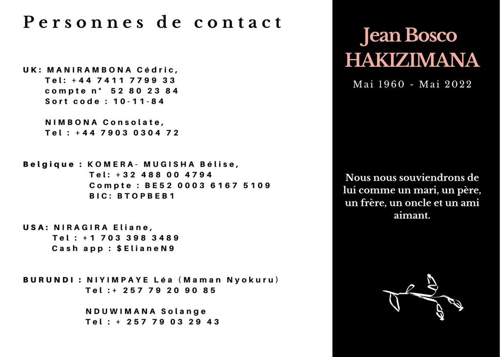 La Rédaction de Burundi-Forum remet ses sincères condoléances à la famille de Feu Hakizimana Jean-Bosco .