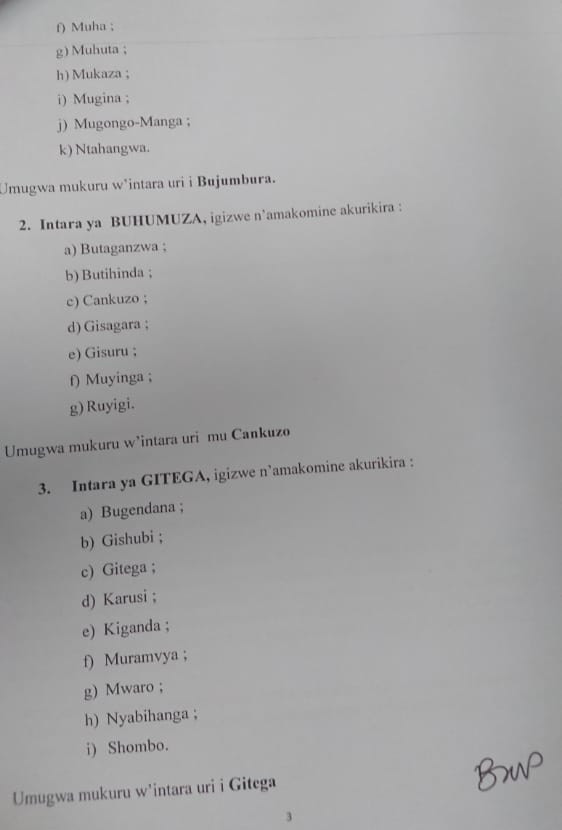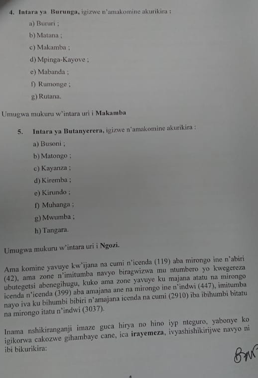 – Butanyerera (chef-lieu Ngozi) : Communes – Busoni, Matongo, Kayanza, Kiremba, Kirundo, Muhanga, Mwumba et Tangara;