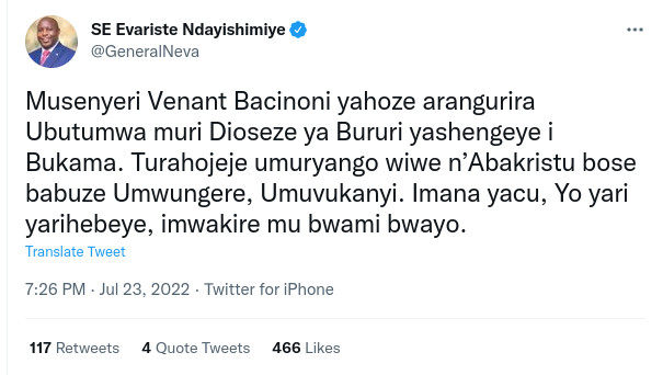 Depuis son compte twitter, S.E. Ndayishimiye Evariste ( Général Major ), Président du Burundi, a rendu un vibrant hommage à ce dernier, à sa famille et à tous les catholiques Barundi : « Musenyeri Venant Bacinoni yahoze arangurira Ubutumwa muri Dioseze ya Bururi yashengeye i Bukama. Turahojeje umuryango wiwe n’Abakristu bose babuze Umwungere, Umuvukanyi. Imana yacu, Yo yari yarihebeye, imwakire mu bwami bwayo« .