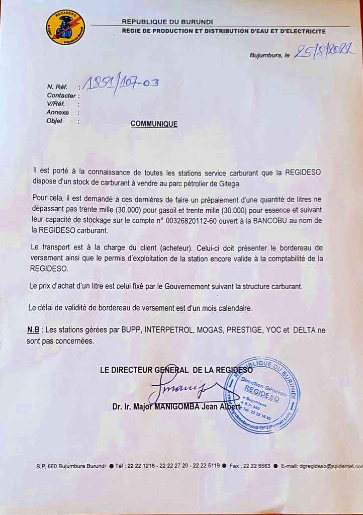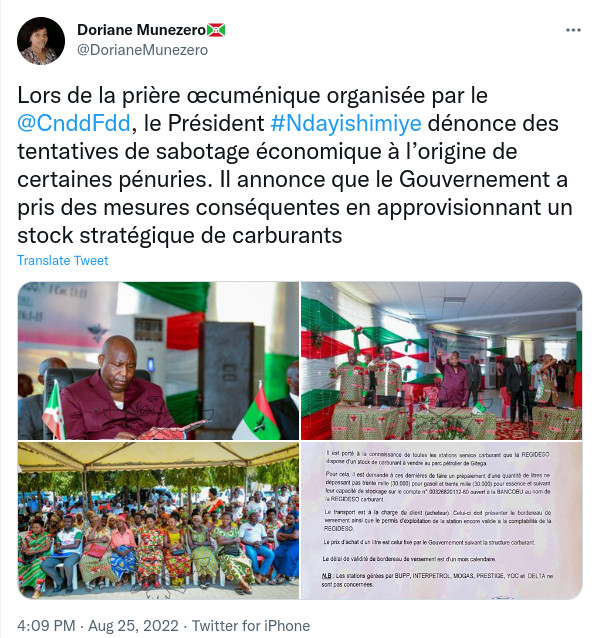 Ce jeudi, Mme Munezero Doriane, Porte-Parole à la Présidence du Burundi, a expliqué, sur son compte twitter, que, pendant la Prière oecumunique Interconfessionnelle clôturant le mois d’Août 2022 au CNDD-FDD, 1ère formation politique du Burundi, rassemblant tous les Bagumybanga ( nom des militants du CNDD-FDD ) de toutes les confessions religieuses autour d’ – Imana – à la Permanence Nationale du Parti, S.E. Ndayishimiye Evariste ( Général Major ), Président du Burundi, a dénoncé les tentatives de sabotage économique à l’origine de certaines pénuries actuelles au Burundi, en annonçant que son Gouvernement venait de prendre des mesures conséquentes en approvisionnant un stock stratégique de carburants. Ajoutant à cette occasion qu’une série de destitutions étaient à venir pour rompre avec ce laxisme dans la gouvernance du pays. Prévenant que les cadres corrompus et incompétents déshonorant le Burundi et le Parti CNDD-FDD allaient être démis de leurs fonctions incessamment.