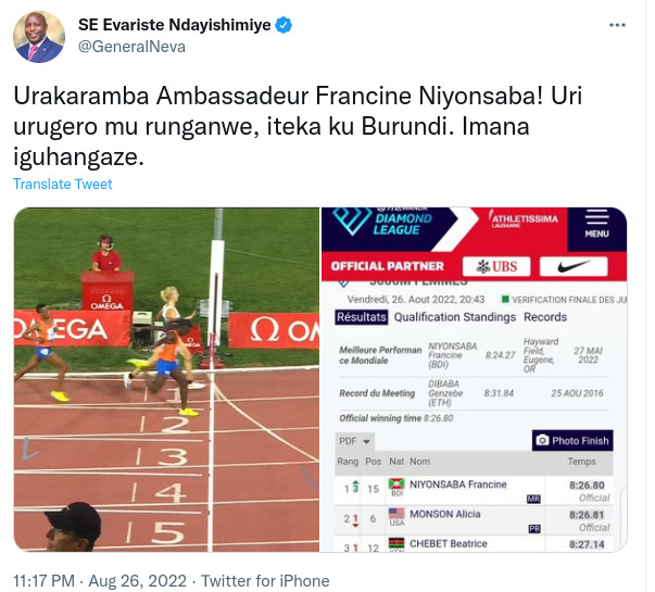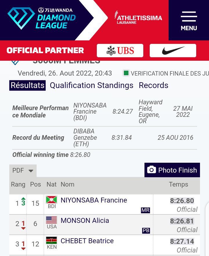 Ce vendredi, pour le grand bonheur des Barundi, Amb. Niyonsaba Francine a remporté, dans le cadre de Ligue de diamant, le 3.000 m Féminin en 8.26.80s. Volant à la seconde près la première place à l’américaine Alicia Monson terminant avec un chrono à 8.26.81s. La kenyane Chebet Beatrice terminant 3 ème avec un chrono à 8.27.14s.