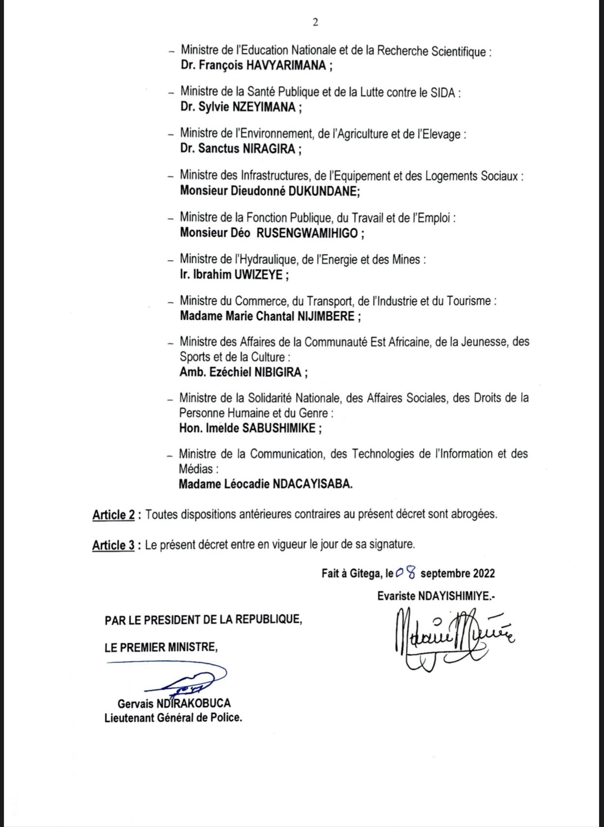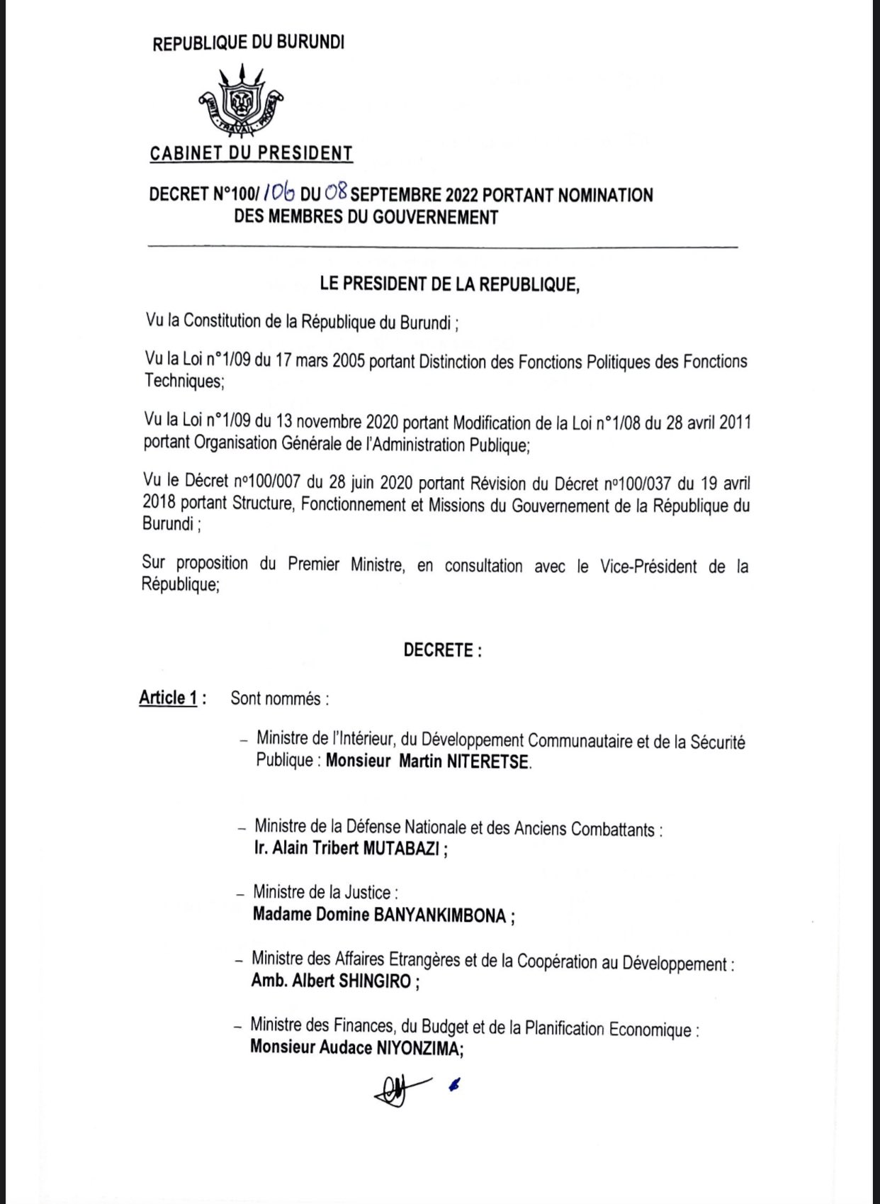 Voir le Décret : [ https://www.burundi-forum.org/wp-content/uploads/2022/09/bdi_burundi_Decret-n-100-06-du-08-septembre-2022-portant-nomination-des-membres-du-gouvernement.pdf ]