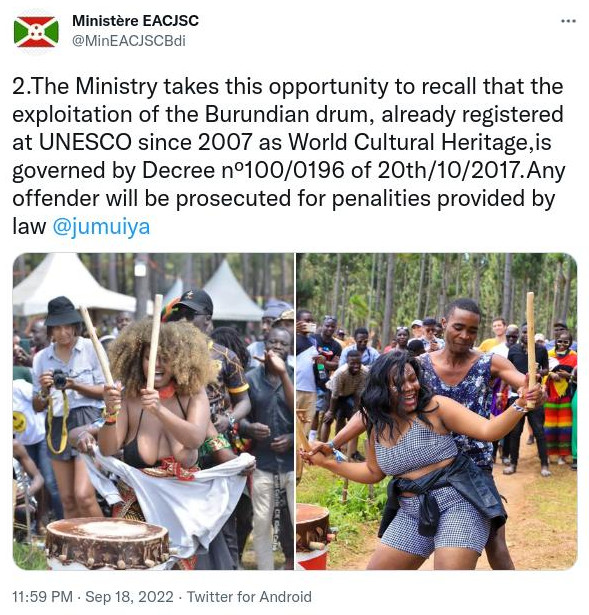 Ce dimanche, sur son compte twitter, le ministère burundais en charge de la culture a réagi aux comportements indécent envers le Tambour du Burundi inscrit au patrimoine culturel de l’UNESCO, ayant eu lieu le samedi 17 septembre 2022 en Ouganda lors du festival de musique Nyege Nyege, se déroulant pendant 4 jours sur les rives du Nil à Itanda Falls dans le sud-est de l’Ouganda précisément à Jinja, connu pour son immoralité, esprit PUNK ( sexe, homosexualité, consommation de drogues, etc.)[1], selon le Parlement Ougandais, destiné à répandre cette culture occidentale à travers le monde.