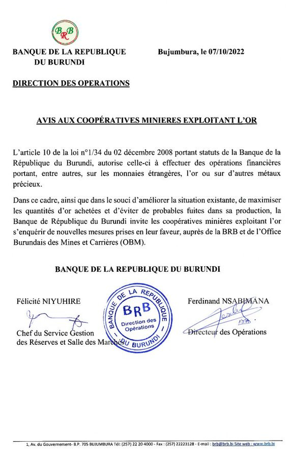 Ce lundi, M. Ndirakobuca Gervais ( Lieutenant Général de Police ), Premier Ministre du Burundi, organisait une réunion d’évaluation trimestriellement, destinée aux exploitants aurifères. Analysant ensemble l’état des lieux de la production d’or après 3 mois de la réouverture des activités d’orpaillage, selon les nouvelles orientations du Gouvernement. Conseillant aux orpailleurs de travailler dans le strict respect de la loi et demandant à ceux qui détenaient encore de l’or de le déposer dans les meilleurs délais au Trésor Public via la Banque du Burundi (BRB).
