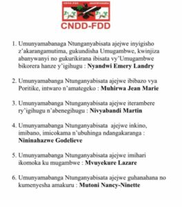 Ce 2 novembre 2022, le Parti CNDD-FDD au pouvoir vient de renouveler ses cadres dirigeants à savoir les Secrétaires Nationaux. Nous vous proposons ci-après les noms et les photos de ces nouvelles personnalités qui incarnent dorénavant les structures de ce Parti au haut niveau. Nous leur souhaitons pleins succès dans leurs nouvelles fonctions.