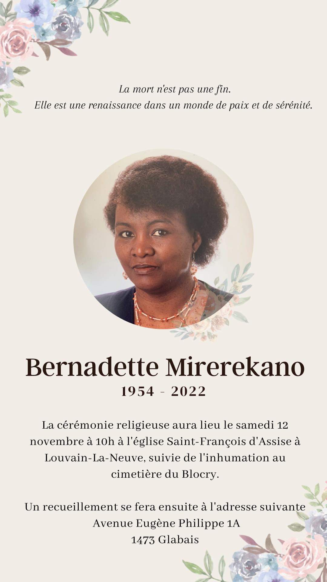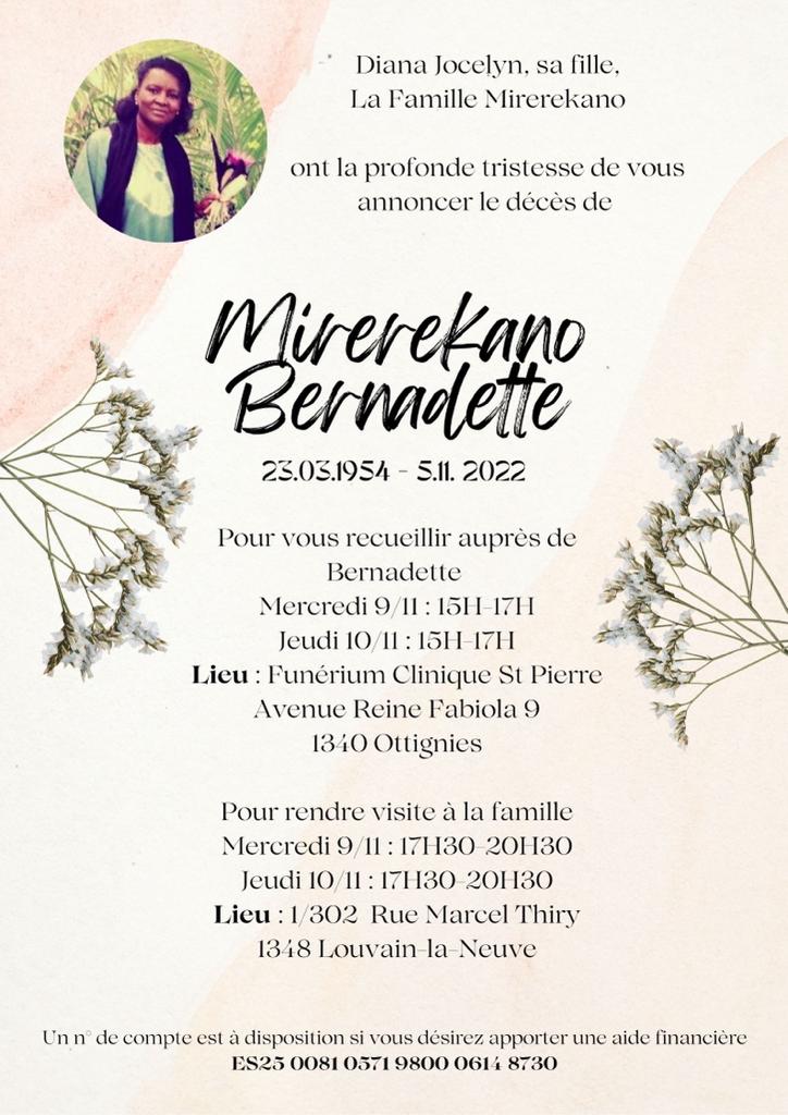 La famille de Mme Mirerekano Bernadette a la profonde douleur d’annoncer aux familles, amis et connaissances le décès inopiné de Mme Mirerekano Bernadette [1] survenu en Belgique.