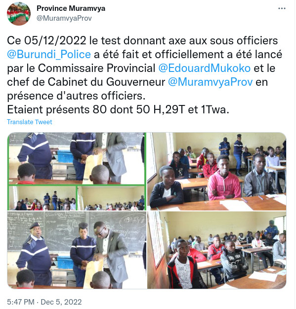 Découlant de l’ethnicisation coloniale de la société burundaise dans l’Accord d’Arusha de 2000 au Burundi porté par la Constitution de 2018 : 50 Hutu, 29 Tutsi et 1 Twa inscrits au test de sous officiers de la police à Muramvya