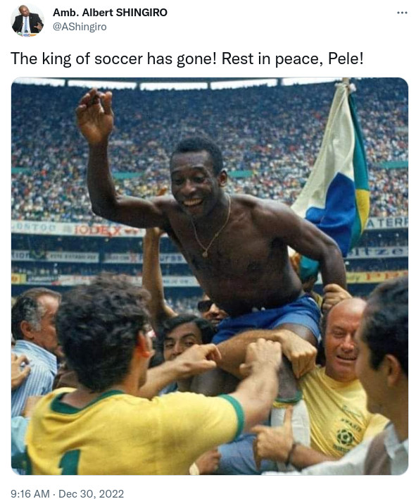 Ce jeudi, au Burundi, M. Shingiro Albert, l’excellent ministre burundais des affaires étrangères , a rendu hommage, sur son compte twitter, à M. – Edson Arantes do Nascimento – , soit Feu « Pele », en ces termes –The king of soccer has gone! Rest in peace, Pele! – . Pelé était un Noir Brésilien, appelé -le Roi du Football-. Il vient de nous quitter à l’âge de 82 ans, suite à une maladie.