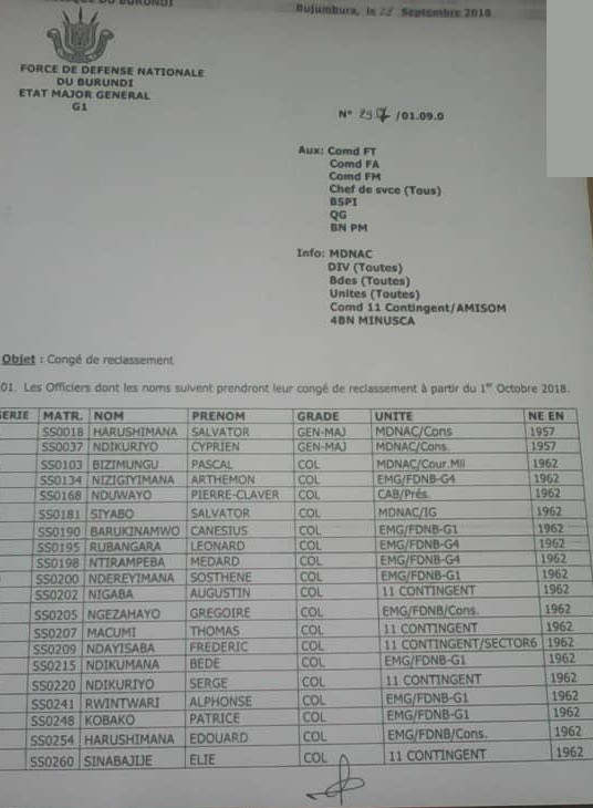 SECURITE, DEFENSE – BUJUMBURA, 21/09/2018 – Le Lieutenant Général Niyongabo Prime a signé un congé de reclassement pour 36 officiers de la Force de Défense Nationale du Burundi (FDNB), qui devait débuter le 1 octobre 2018.