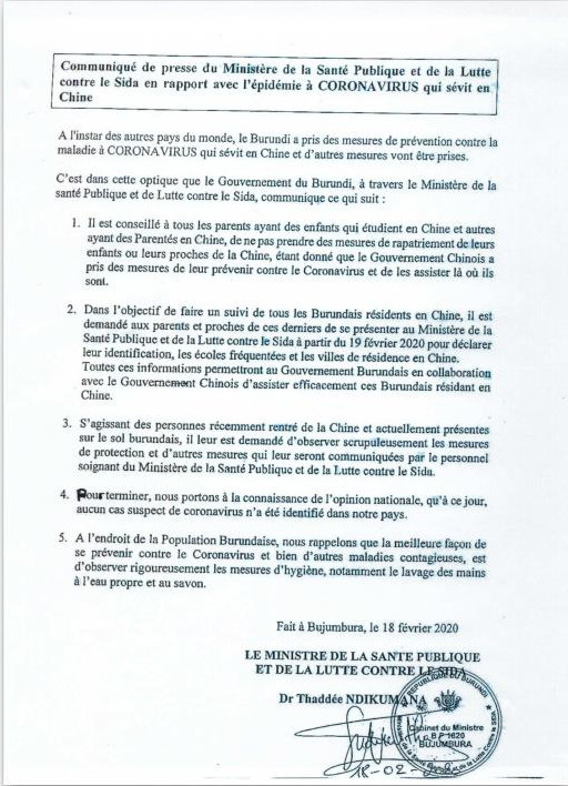 Voici ce COMMUNIQUE : https://www.burundi-forum.org/wp-content/uploads/2020/03/bdi_burundi_CommuniqueduMinisante_sur_e-coronavirus_18fev2020.pdf