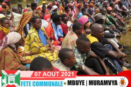 MURAMVYA ( Commune MBUYE ), 7/08/2021 – Mme NDAYISASIRIRE Evelyne, Administrateure communale de MBUYE, organisait la fête communale 2021 avec tous les citoyens et les originaires de sa localité. Notamment des personnalités comme l’Hon. GASHATSI Abel, Vice Président de l’assemblée Nationale du BURUNDI ; l’Amb. NSANZE Augustin, histoirien burundais de renommé et ancien Ministre burundais des Affaires Etrangères ; l’Hon. NIRAGIRA Silas ; M. BARUTWANAYO Joachim, Président du conseil communal de MBUYE etc. Projetant dans la salle polyvalente un documentaire relatant les grandes réalisations. Échangeant sur le bilan de LA POLITIQUE SOCIO-ECONOMIQUE de leur commune. Puis partageant ensemble dans la joie quelques mets locaux et autres boissons …