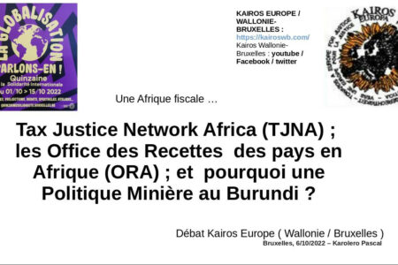 Bruxelles, 6/10/2022 – Cadrant avec la Quinzaine de la Solidarité Internationale, avec pour thématique « Globalisation parlons-en « , espérant contribuer à une réflexion concernant les inégalités sociales existantes dans notre monde, jeudi, M. Karolero Pascal, Kairos Europe ( Wallonie – Bruxelles ) avait préparé, pour cette occasion, une intervention de 12 minutes sur la dynamique d’une Afrique fiscale.