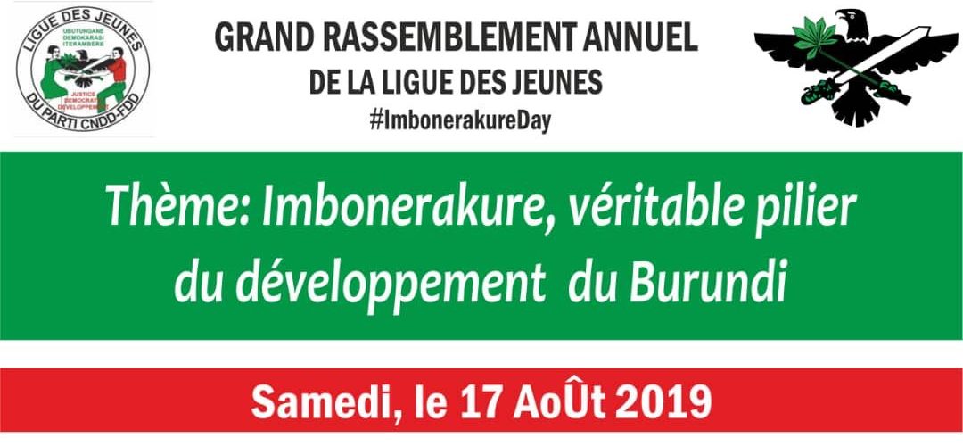 POLITIQUE – BUJUMBURA, 16/08/2019 – Le CNDD-FDD, première formation politique du Burundi, organise, dans les 18 provinces du pays, ce samedi 17 Aout 2019, le grand rassemblement annuel de la ligue des jeunes IMBONERAKURE avec comme thématique : »Imbonerakure, véritable pillier du développement du Burundi« .Les jeunes burundais, militants du CNDD-FDD, agés de moins de 35 ans, sont appelés – IMBONERAKURE –