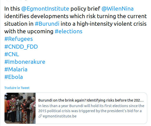 Comme en 2013-2014, avec « le fameux 3ème mandat » , de la Belgique via un tweet de l’ Egmont Institute ( Ministère Belge des Affaires Etrangères ), la thématique de perturbation électorale pour les élections de 2020 au Burundi vient d’être lancée ce mardi 15 octobre 2019.