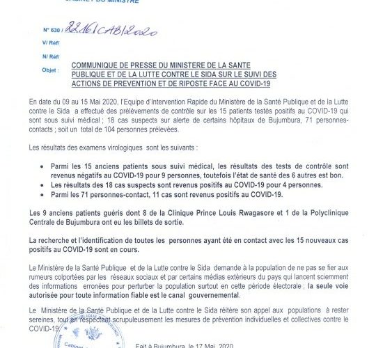 BUJUMBURA, 17/05/2020 – Le Ministère burundais de la Santé Publique (MSPLS) a sorti un communiqué de presse. Faisant le point sur la situation COVID-19 au Burundi.