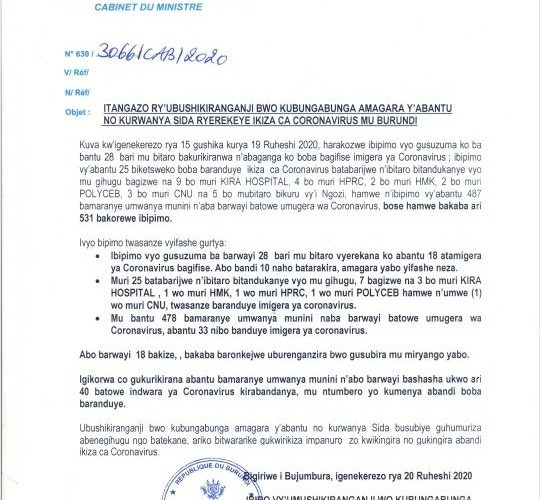 BUJUMBURA, 20/06/2020 – Le Ministère burundais de la Santé Publique (MSPLS) a sorti un communiqué de presse.  Faisant le point sur la situation COVID-19 au Burundi.