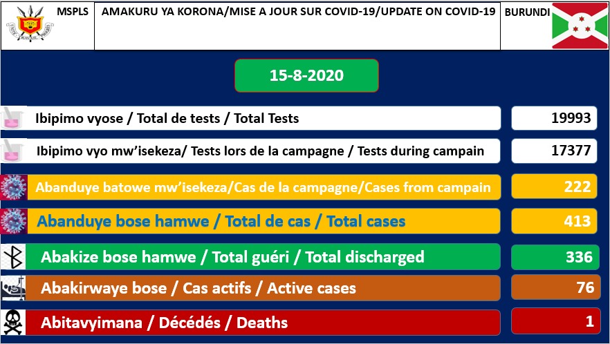 La situation COVID-19 au Burundi est désormais [ https://burundi-forum.org/covid-19/ ] ce samedi 15 août 2020 :