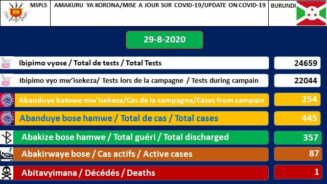 La situation COVID-19 au Burundi est désormais [ https://burundi-forum.org/covid-19/ ] ce samedi 29 août 2020 :