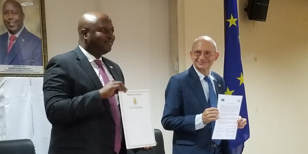 BUJUMBURA, 2/02/2021 – Recevant M. BOCHU Claude, Ambassadeur de l’Union Européenne (EU) au BURUNDI. M. SHINGIRO Albert, l’excellent Ministre burundais des Affaires Étrangères et de la Coopération au Développement (MAECD), organisait une activité d’échange ou de dialogue avec l’Union Européenne (UE) au BURUNDI. Convoquant les ambassadeurs de 4 États membres de l’UE, résidents au BURUNDI : LA FRANCE , LA BELGIQUE, L’ALLEMAGNE et LES PAYS-BAS. Consistant à entrevoir comment reprendre LA COOPERATION DIRECTE ENTRE LE BURUNDI ET L’UE, stoppée en 2016. Ce dialogue s’est clôturé par un communiqué de presse conjoint signé par les 2 parties.