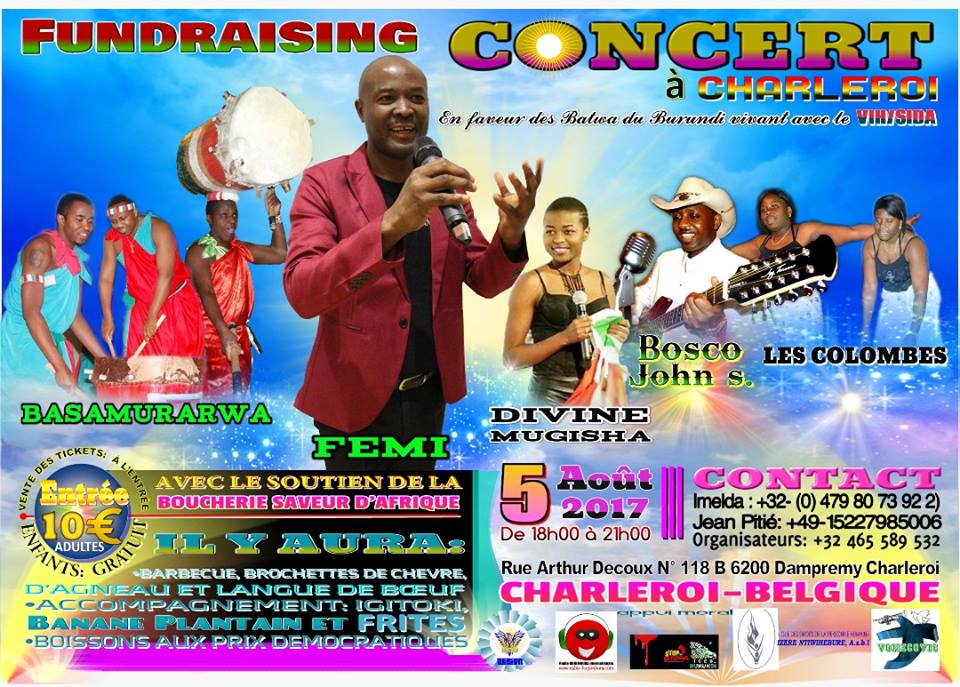 Le – Fundraising Concert – aura lieu RUE ARTHUR DECOUX N°118 B 6200 DAMPREMY à CHARLEROI en BELGIQUE, le samedi 5 août 2017 de 18H à 21H, avec des artistes qui se produiront tel les TAMBOURINAIRES -BASAMURARWA- ; DIVINE MUGISHA ; BOSCO JOHN S ; et les COLOMBES.