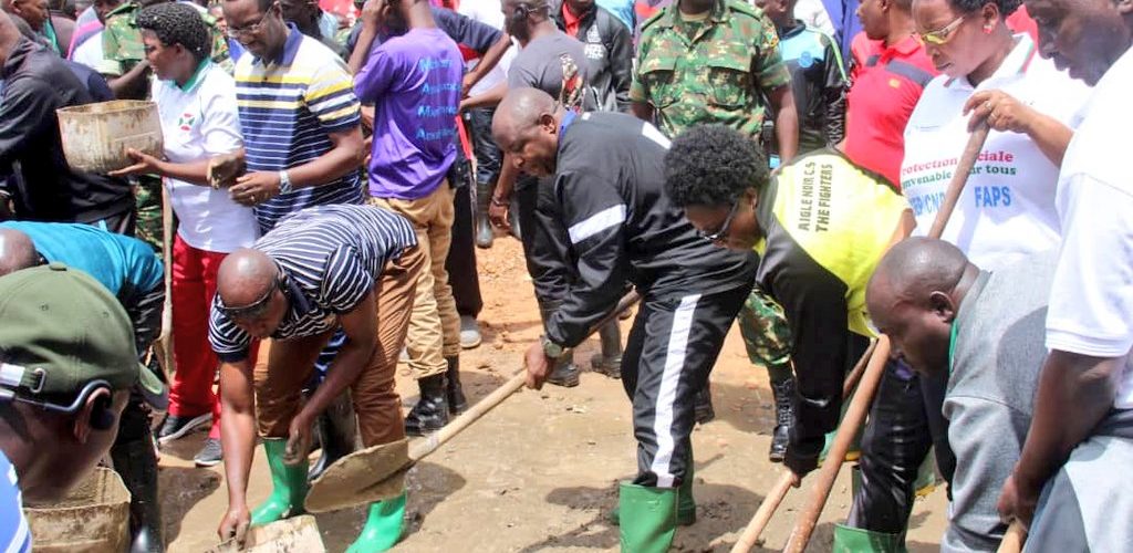 RUYIGI, 10/04/2021 – Accompagné de membres du Gouvernement et de hautes personnalités du pays. S.E. NDAYISHIMIYE Evariste ( Général Major ), Président du BURUNDI, participait aux TRAVAUX DE DEVELOPPEMENT COMMUNAUTAIRE [ TDC – http://burundi-agnews.org/TDC ]. S’associant à la population locale. Consistant à bâtir le nouveau Bureau Provincial de RUYIGI. Pelle en main, préparant le ciment pour être amener vers le chantier en file indienne.